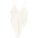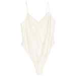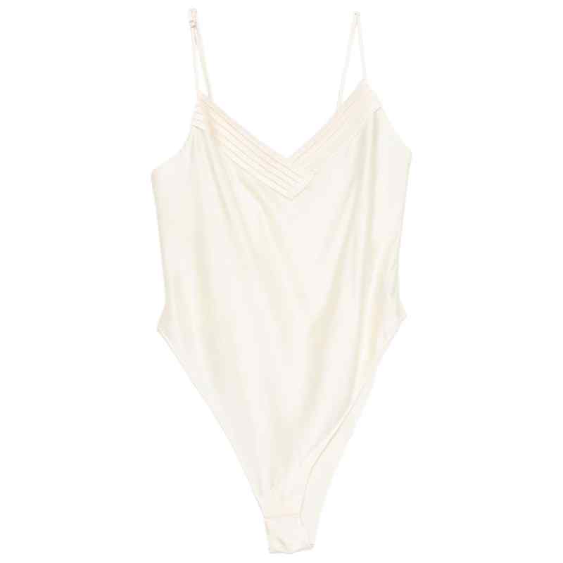 light beige V-neck slim straps pleated detail Just a reminder that this piece must be tried on over your own garments. Silk satin bodysuit.
