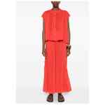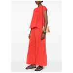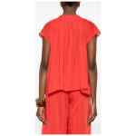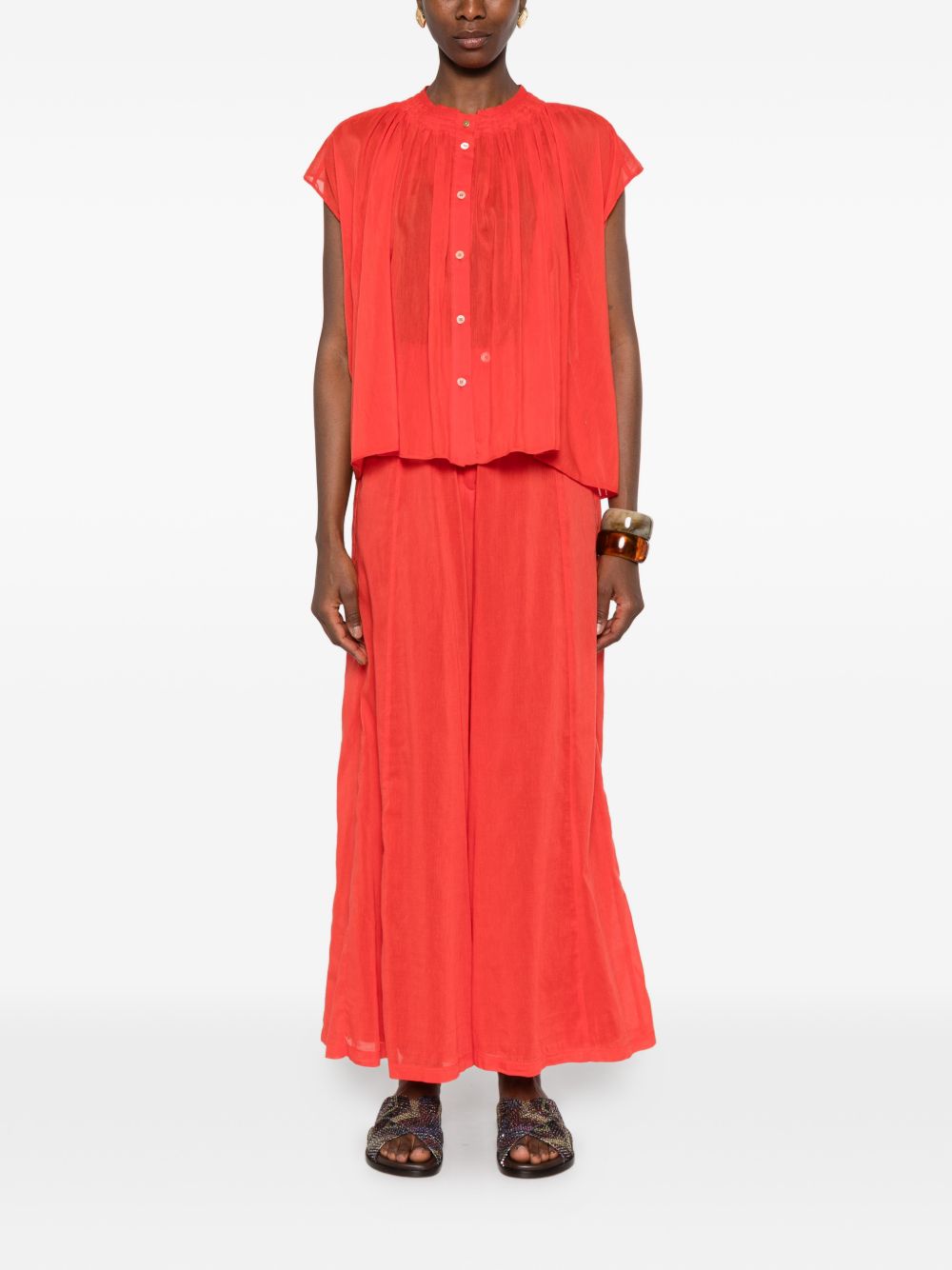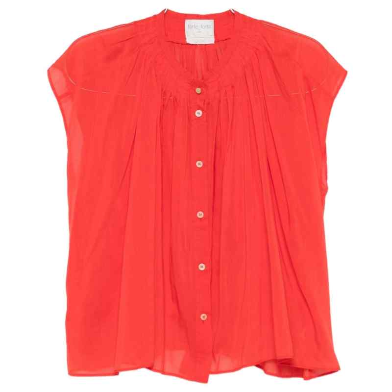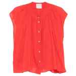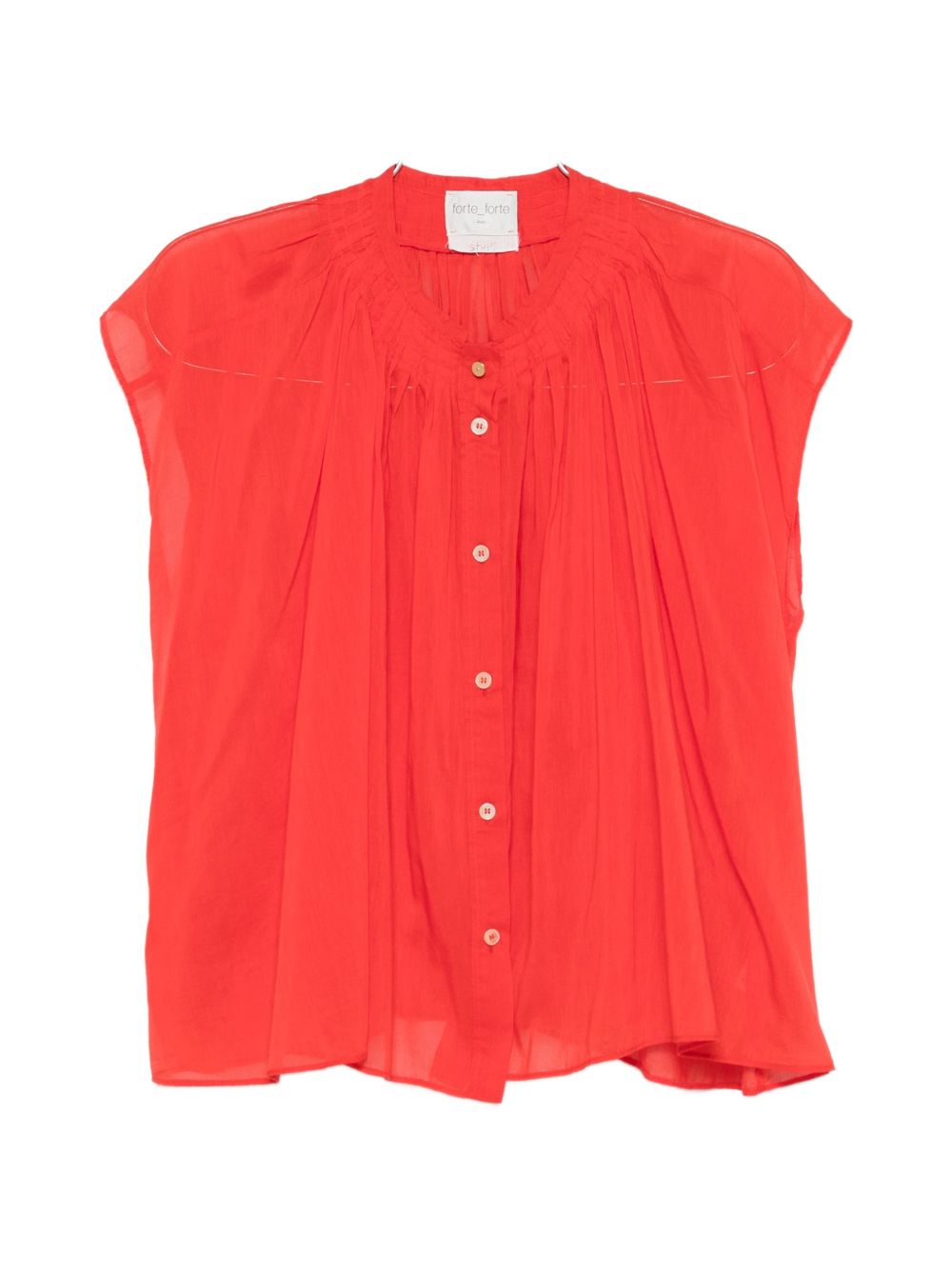 red front button fastening gathered detailing cap sleeves semi-sheer Voile cotton and silk shirt.