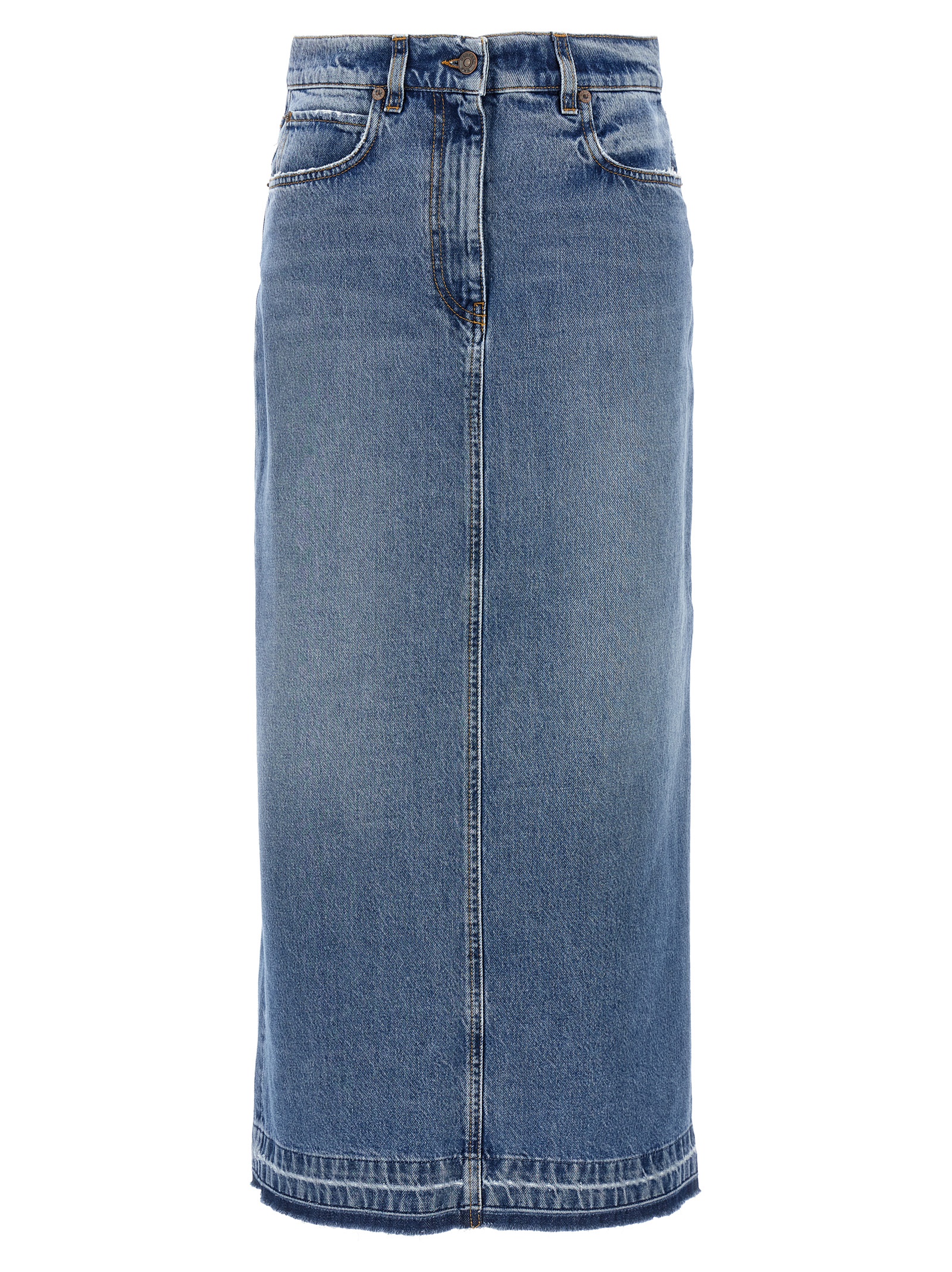 ‘Jorgy’ cotton denim skirt with used-effect details, zip and button closure, five pockets, back split.