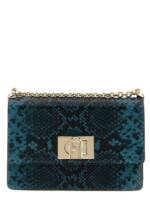 ‘furla 1927’ mini crossbody bag in python-printed leather with flap closure with metal spin with arco logo, Back pocket, Sliding chain shoulder strap with leather shoulder protection. Size and Fit – W 19.5 x H 12 x D 7 cm