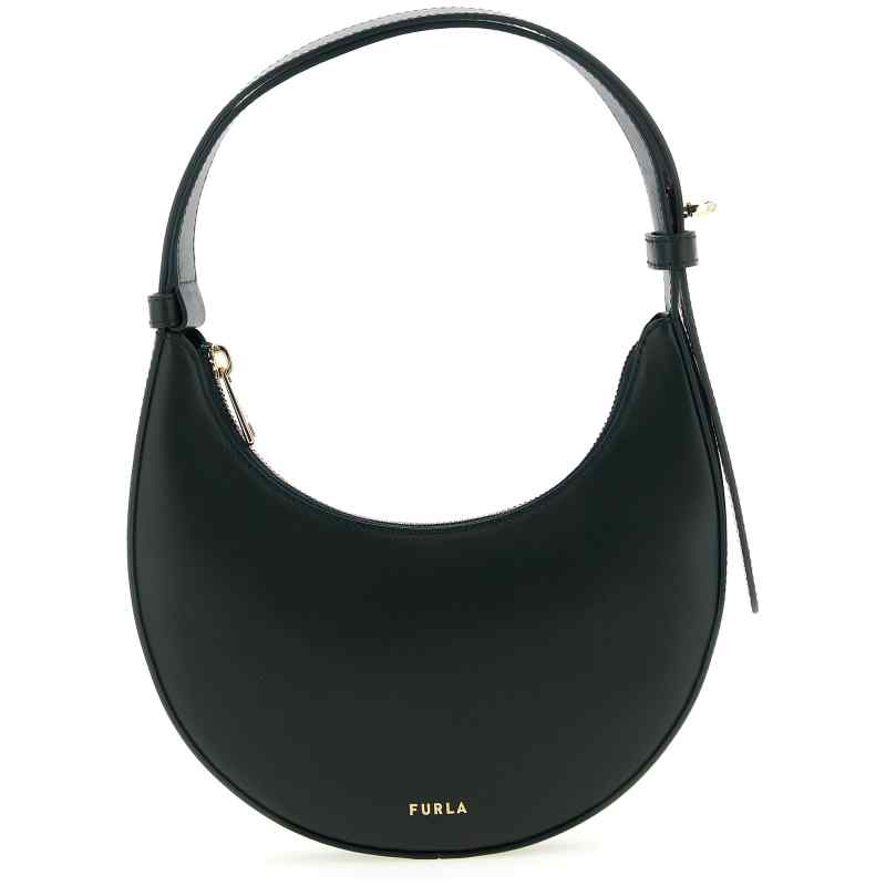 ‘furla delizia’ mini leather shoulder bag with a silky and smooth touch, Rigid crescent structure, Front embossed logo, Top zip closure, Adjustable handle with metal swivel mechanism.