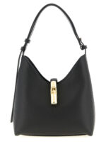 Small ‘furla goccia’ shoulder bag in smooth leather and printed midnight calfskin leather, Hobo model, Soft and unstructured silhouette, Cylindrical hardware closure with weight and carved ‘arco furla’ logo, Back embossed lettering logo, Adjustable handle, Rigid base with metal feet, Lining, Two inner pockets. Size and Fit – W 24 x H 24 x D 12 cm