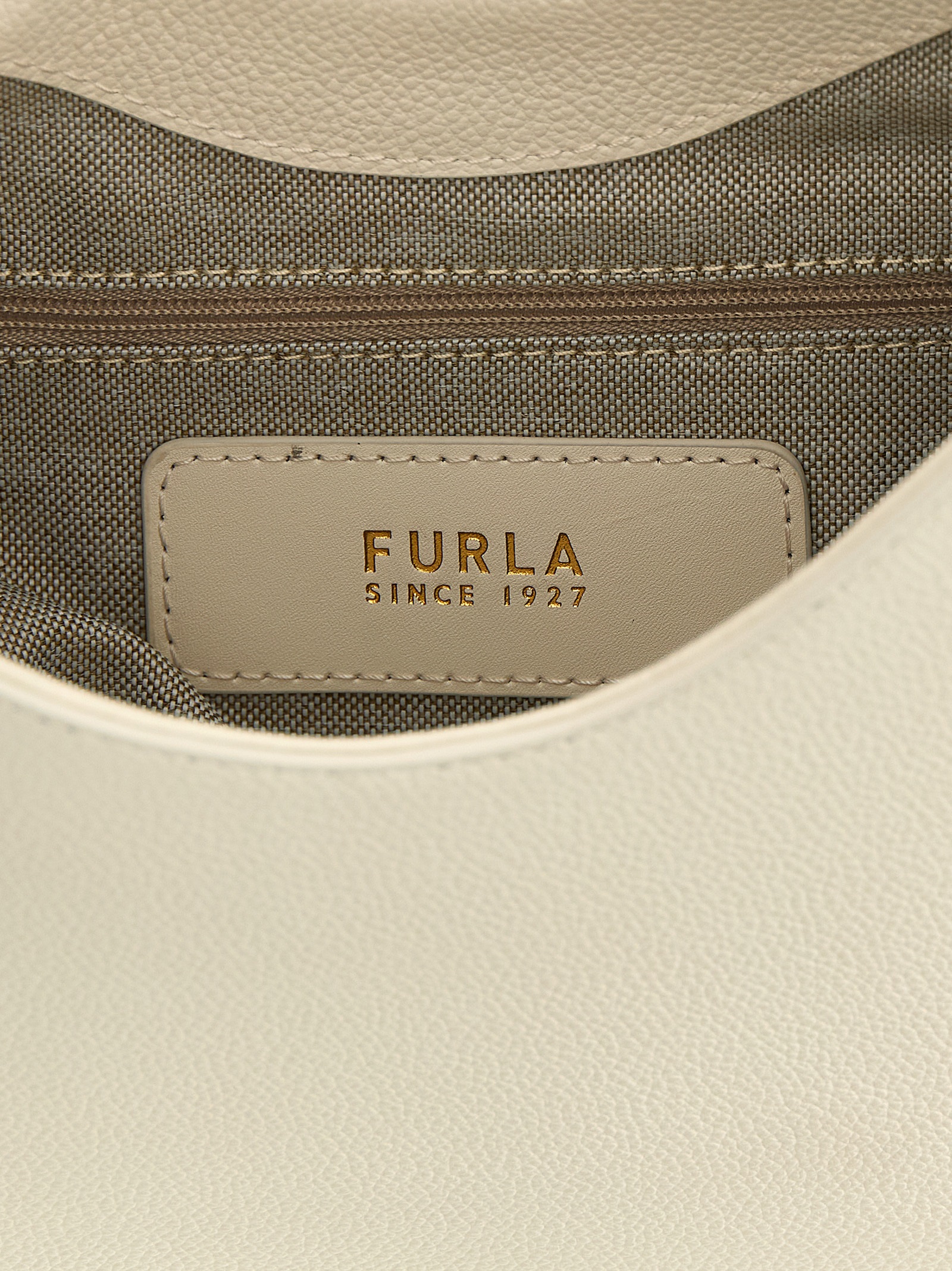 Small ‘furla goccia’ shoulder bag in smooth leather and printed midnight calfskin leather, Hobo model, Soft and unstructured silhouette, Cylindrical hardware closure with weight and carved ‘arco furla’ logo, Back embossed lettering logo, Adjustable handle, Rigid base with metal feet, Lining, Two inner pockets. Size and Fit – W 24 x H 24 x D 12 cm