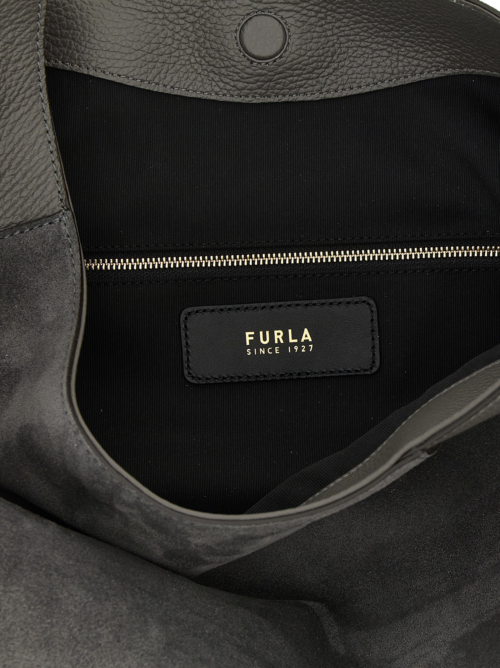 ‘furla lara’ large shoulder bag in suede and smooth tone-on-tone calf leather, Front metal lettering logo, Magnetic closure, Fixed handle with iconic arco logo with metal ball element. Size and Fit – W 35 x H 30 x D 13 cm
