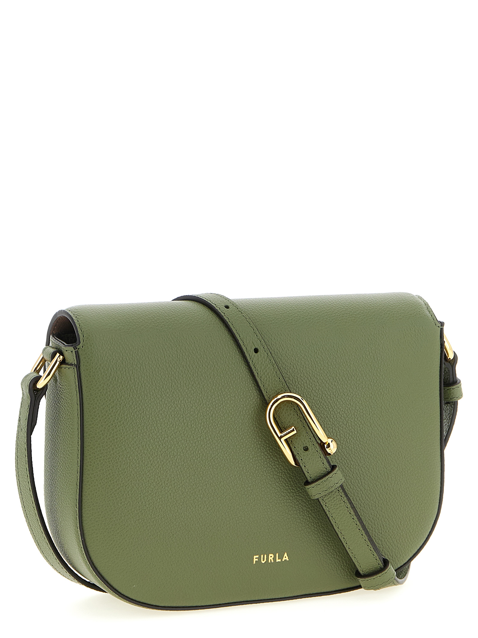 Small fine leather ‘furla moonlight’ crossbody bag with a light hammered finish, Magnetic flap closure with iconic metal ‘sfera’ logo on the front, Embossed logo on the back, And adjustable shoulder strap. Size and Fit – W 20 x H 15 x D 5.5 cm