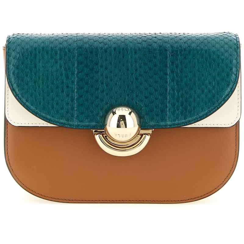 ‘furla sfera’ smooth calf leather mini crossbody bag, Contrast elaphe lux leather flap closure with metal ball closure, Saddle design, Adjustable and removable shoulder strap. Size and Fit – W 20 x h 14 x d 7 cm