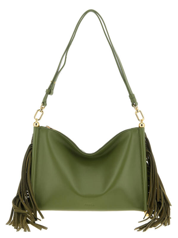 ‘furla sfera soft’ nappa mini shoulder bag, Tone-on-tone fringes and metal ball hardware on the sides, Front embossed logo, Top zip closure, Adjustable and removable shoulder strap. Size and Fit – W 24.5 x H 18.5 x D 2 cm
