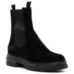 brown suede tonal stitching elasticated side panels double pull-tab at the opening round toe slip-on style branded leather insole ridged rubber sole ankle-length Chester suede leather boots