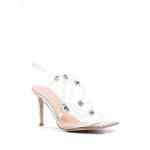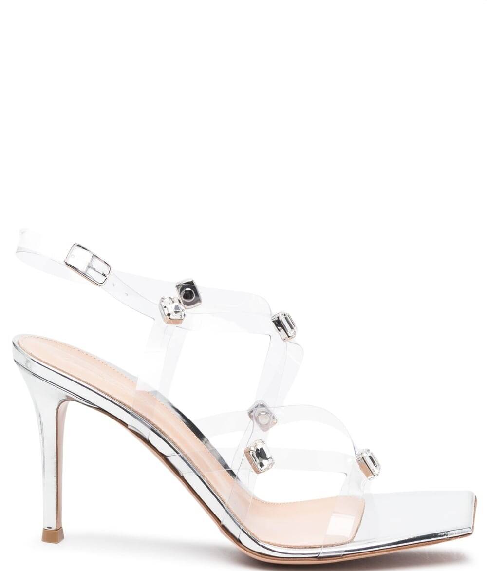 Crystal Fever 85mm sandals from GIANVITO ROSSI featuring silver-tone, calf leather, transparent design, crystal embellishment, buckle-fastening ankle strap, open toe and high stiletto heel. Crystal Crash sandals