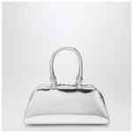 Givenchy silver laminated leather handbag, featuring an adjustable and removable shoulder strap, long East-West shape, leather handles, zip closure, front logo signature, and a main compartment with a card slot inside.