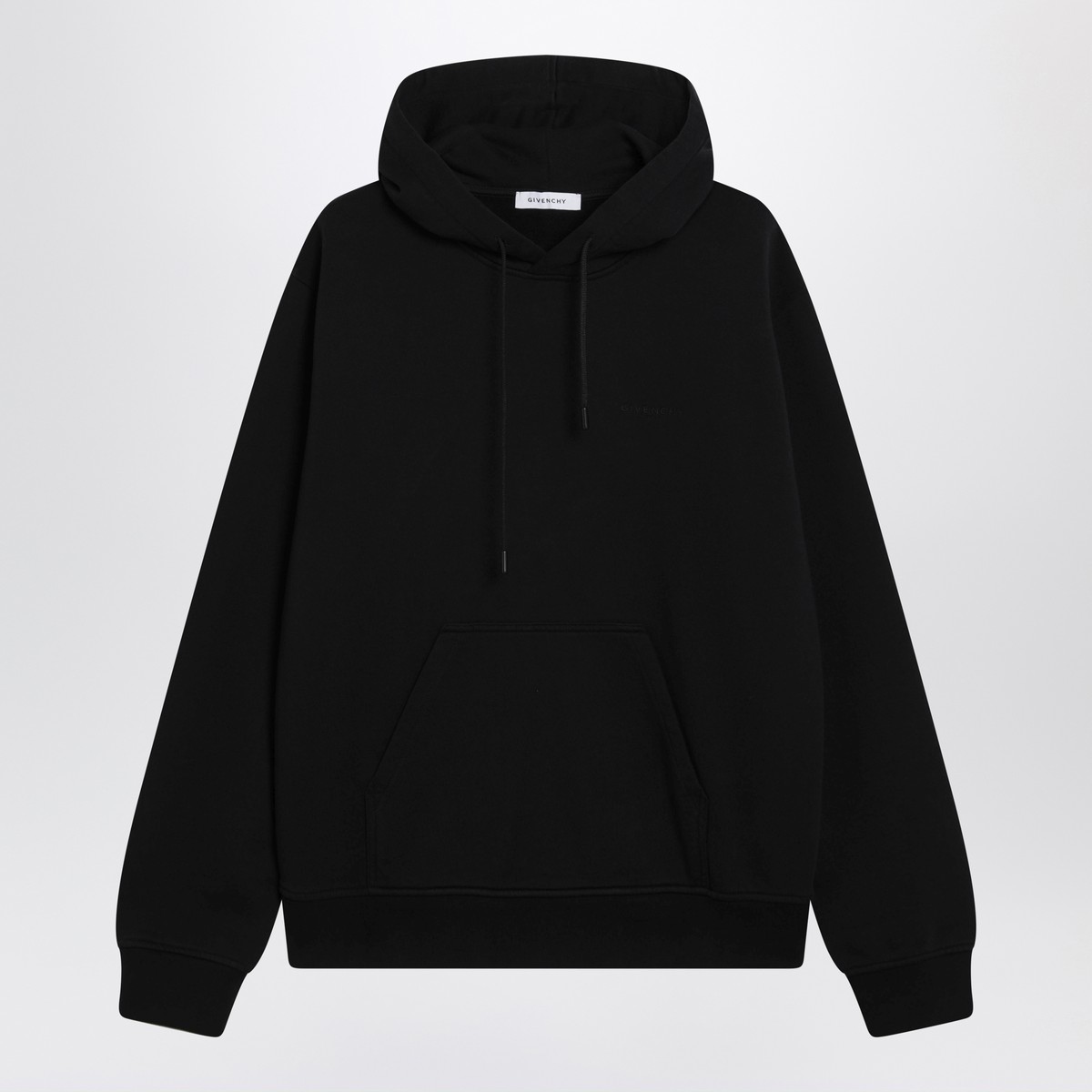 Givenchy sweatshirt in black brushed cotton, featuring drawstring hood, long sleeves, kangaroo pocket, tone-on-tone logo lettering on the chest, Clapperboard print on the back, and ribbed trims.