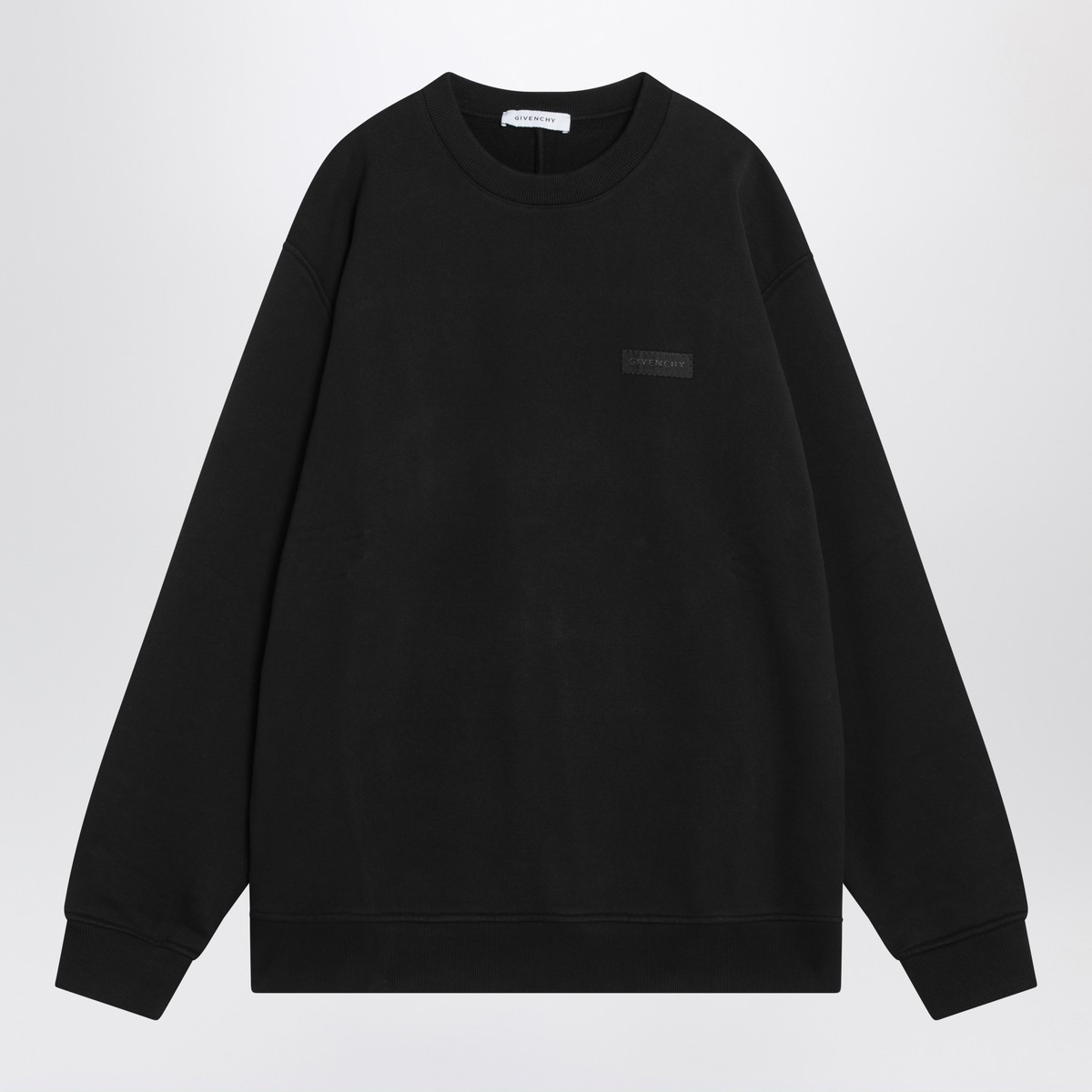 Givenchy black cotton crew neck sweatshirt, characterized by logo label on the chest, ribbed collar, cuffs, and hem.
