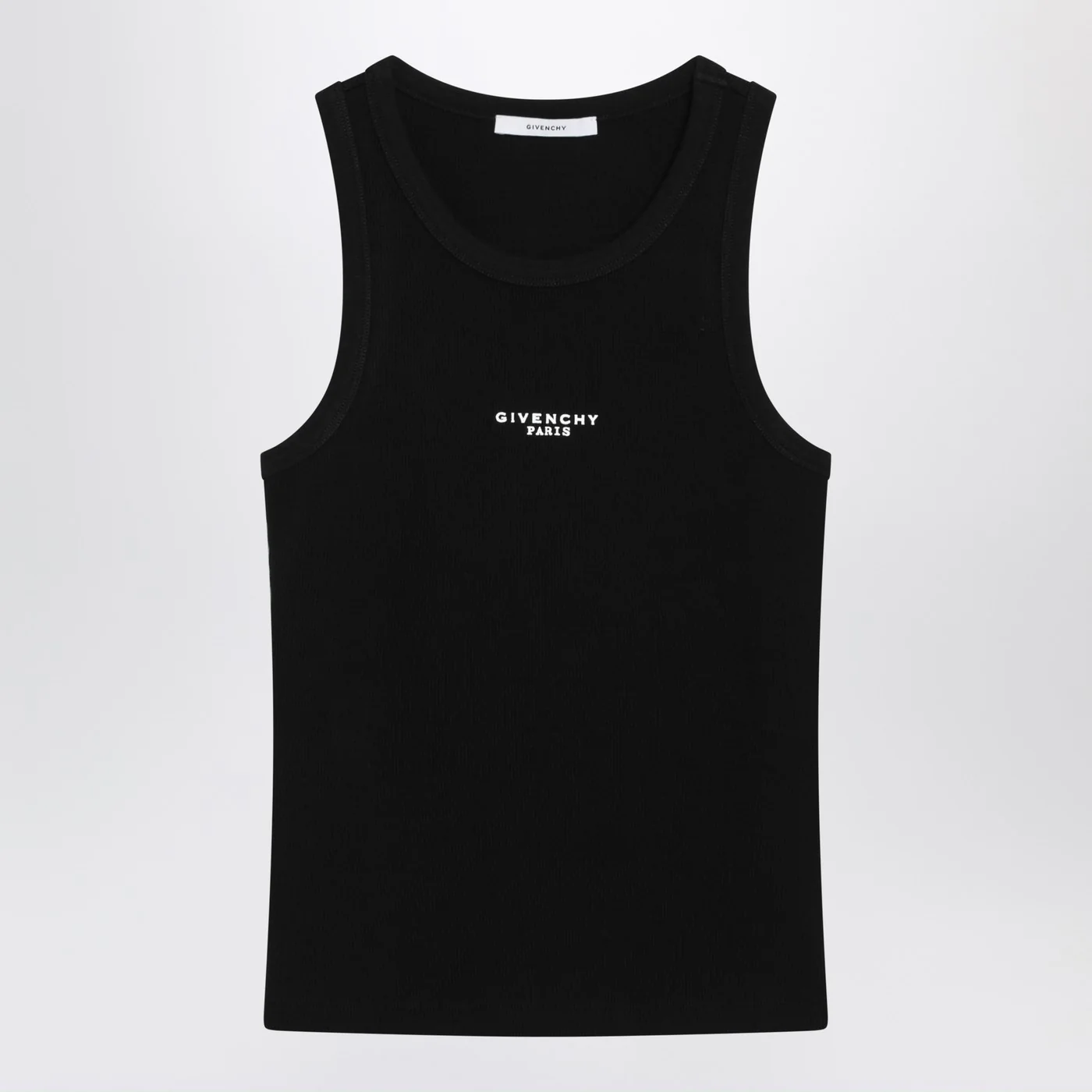 Crewneck tank top by Givenchy in black cotton Slim ribbed fit Contrasting logo lettering print on the chest. Size and Fit – Model wears size S Model measurements: Height: 181 cm Chest: 81 cm Waist: 62 cm Hips: 89 cm