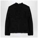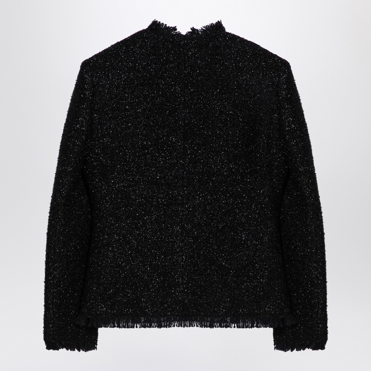 Black wool-blend tweed crewneck jacket with lurex by Givenchy, features long sleeves, front hooks and frayed edges.