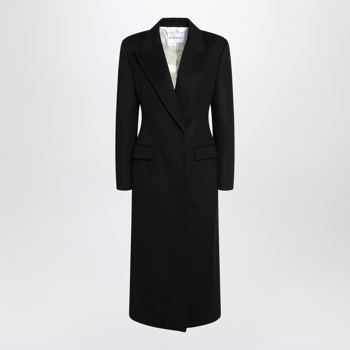 Givenchy coat in black wool, characterized by a lance lapel, long sleeves with buttoned cuffs, a welt pocket on the chest, two flap pockets on the front, a vent at the back, and a hidden front button closure.