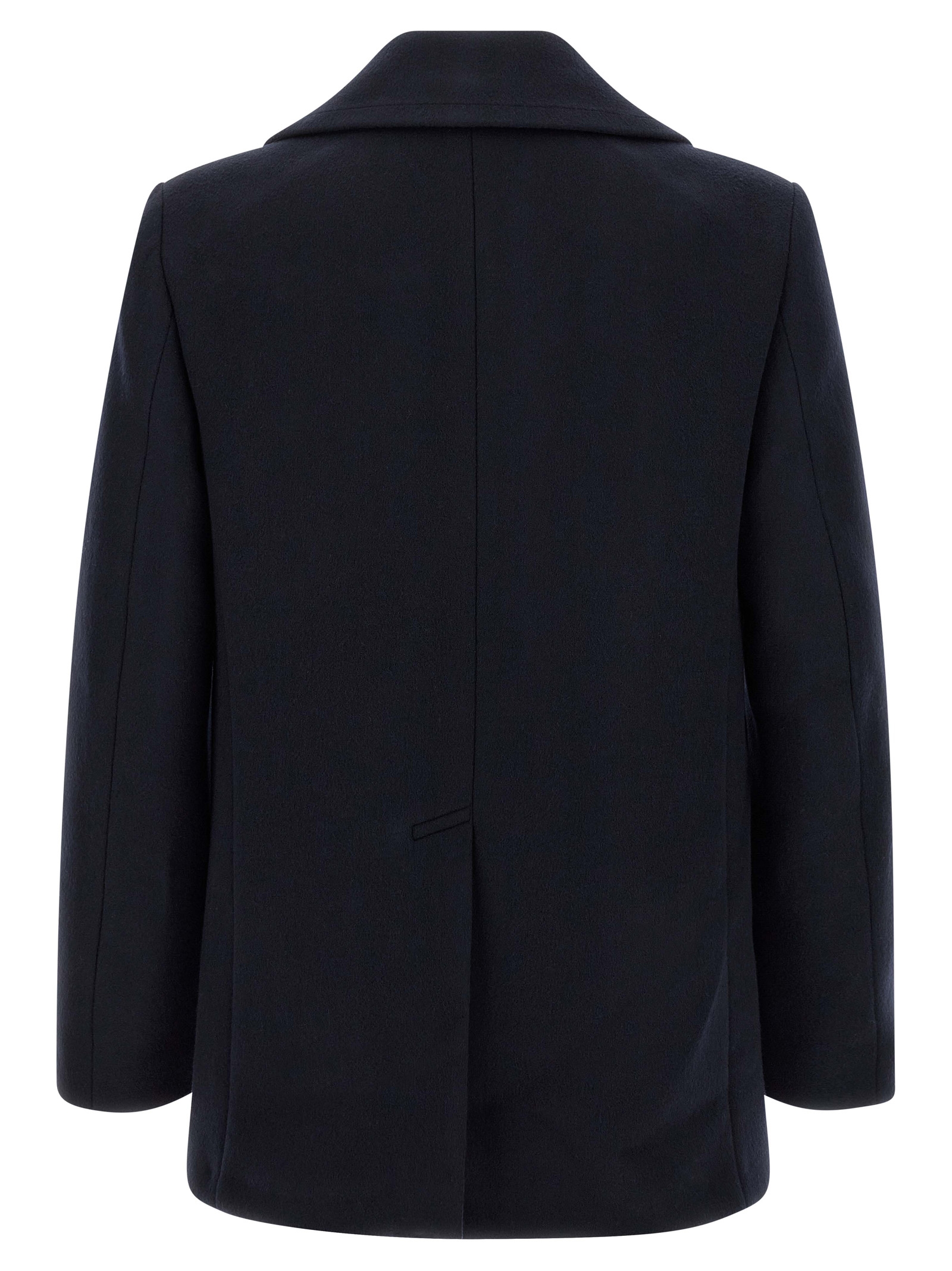 Double-breasted wool caban with button closure, Gold button with logo engraving on the upper part, Side pockets, Long sleeves. Size and Fit – True to size fit