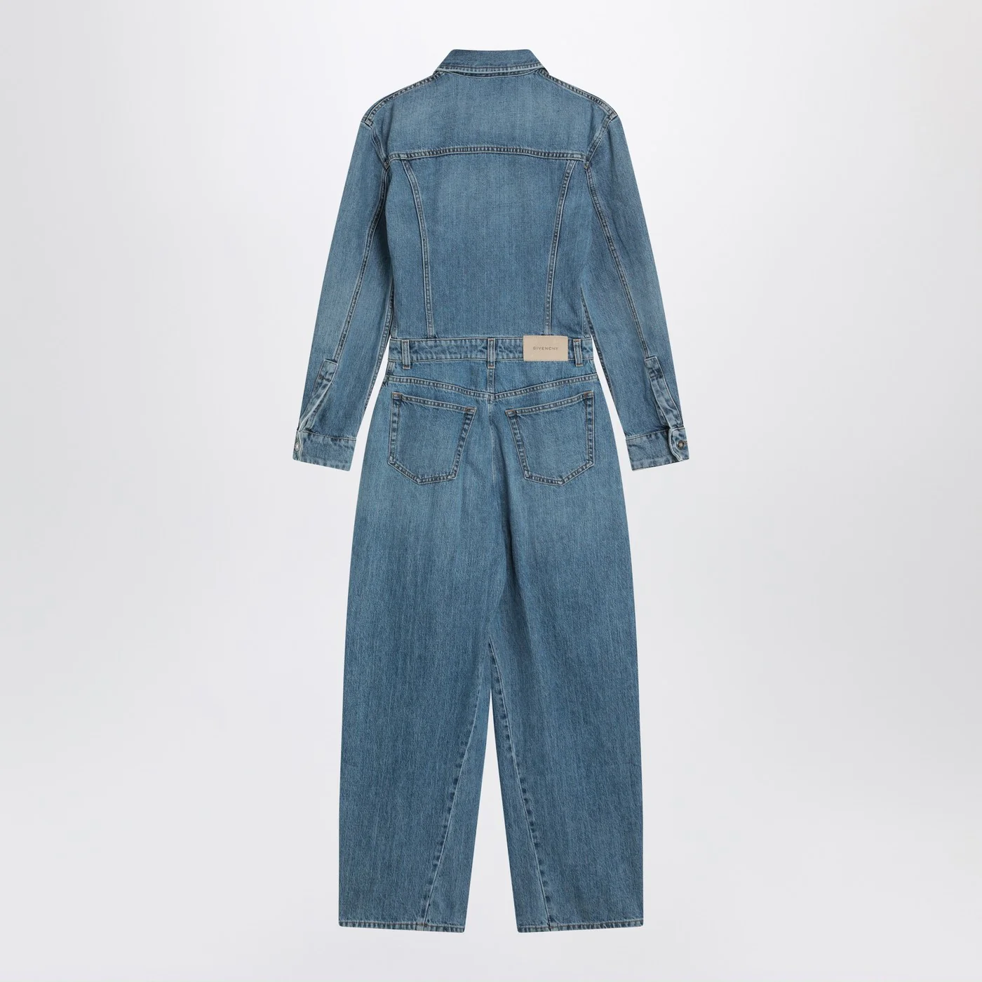 Medium blue cotton denim jumpsuit by Givenchy characterized by long sleeves with buttoned cuffs hidden front buttoning two applied pockets on the back visible stitching rear logo patch and wide leg.
