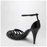 Givenchy sandals in black patent leather featuring cage design, thin ankle strap with metal buckle, inner leather insole with logo label, round toe and thin heel.