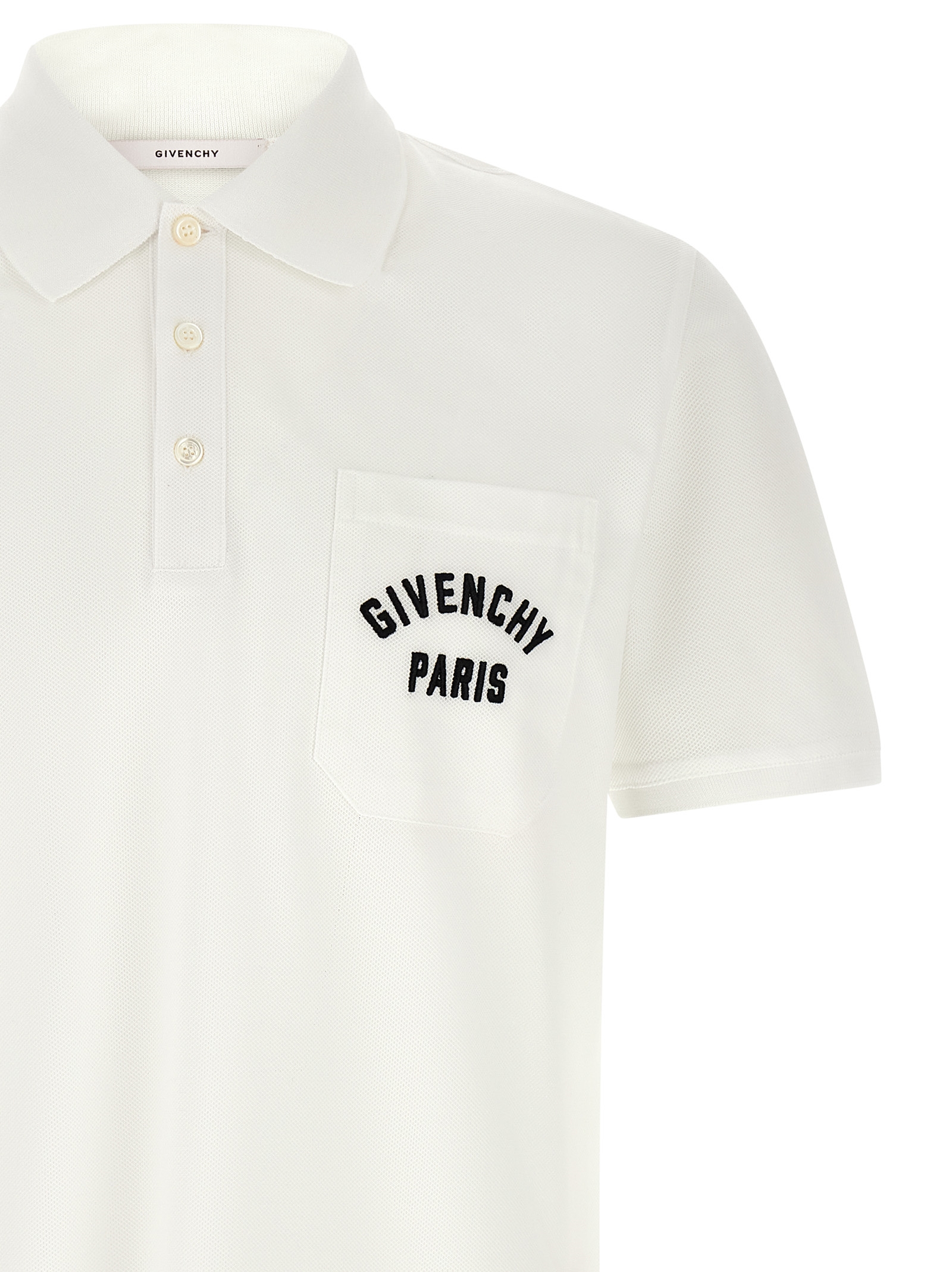 Cotton piqué polo shirt, pocket with contrast ‘Givenchy Paris’ embroidery, collar and buttons, short cuffed sleeves, side slits, and asymmetrical hem.