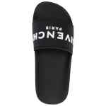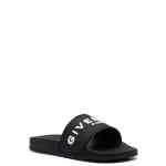 logo-debossed moulded-footbed slides from Givenchy featuring black, debossed logo to the front, open toe, moulded footbed and flat rubber sole. Logo pool slides
