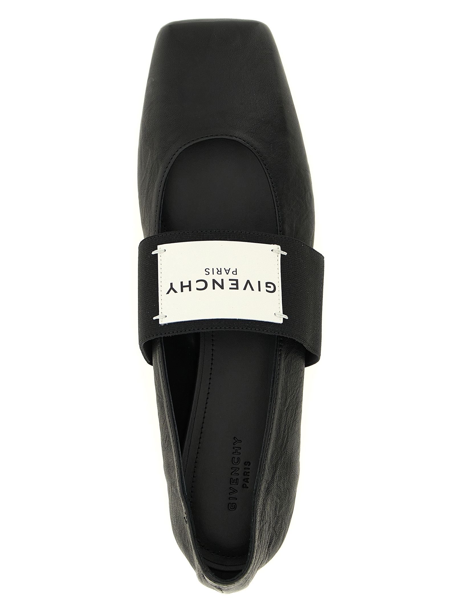 Textured lambskin leather ballet flats with ‘Sliced Square’ line with square toe, upper elastic band with contrast ‘GIVENCHY Paris’ logo patch, leather sole with rubber heel.