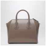 Small handbag by Givenchy in taupe leather featuring leather handles, adjustable and removable strap, zip closure, gold-tone metal logo lettering on the front, canvas lining and internal welt pocket with zip.