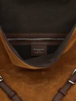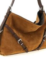 Medium suede shoulder bag with contrasting leather details, ‘voyou’ line, Soft v-silhouette, Embossed logo and strap detail with metal buckles on the front, Adjustable handle, Canvas lining, An inner pocket. Size and Fit – W 38 x H 31 x D 10 cm