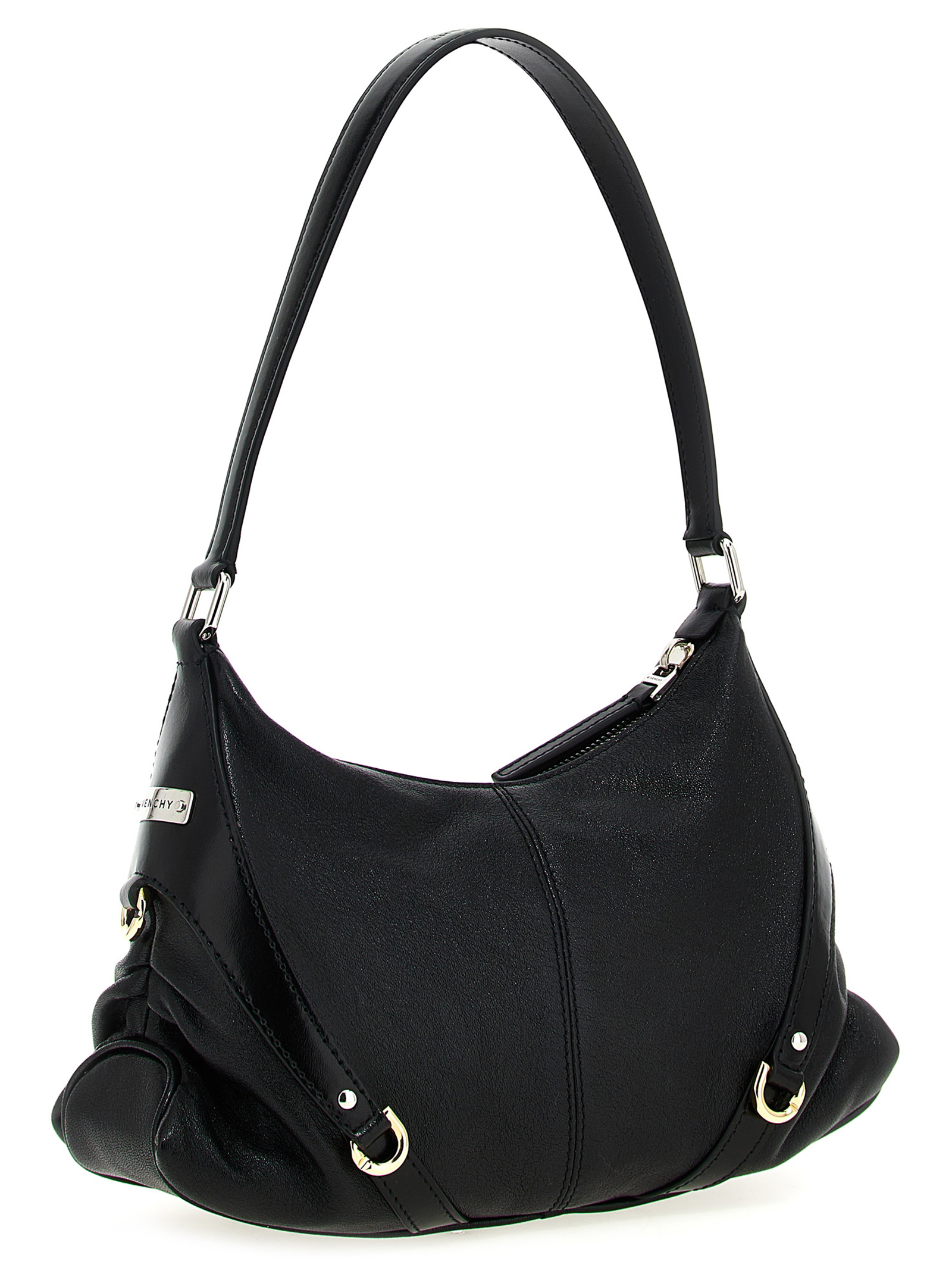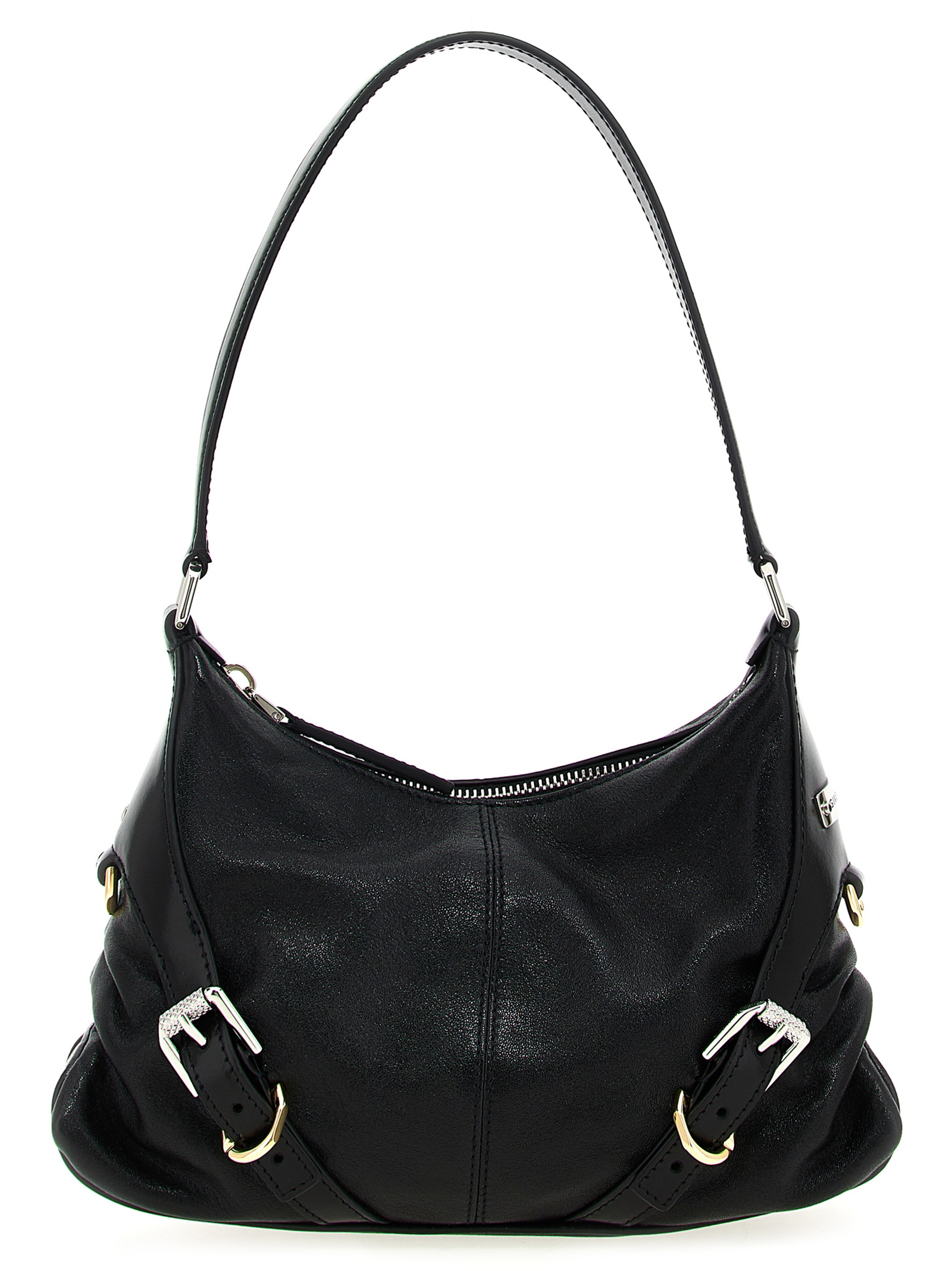 Small ‘Voyou’ leather shoulder bag with top zip closure, fixed handle, buckle detail.