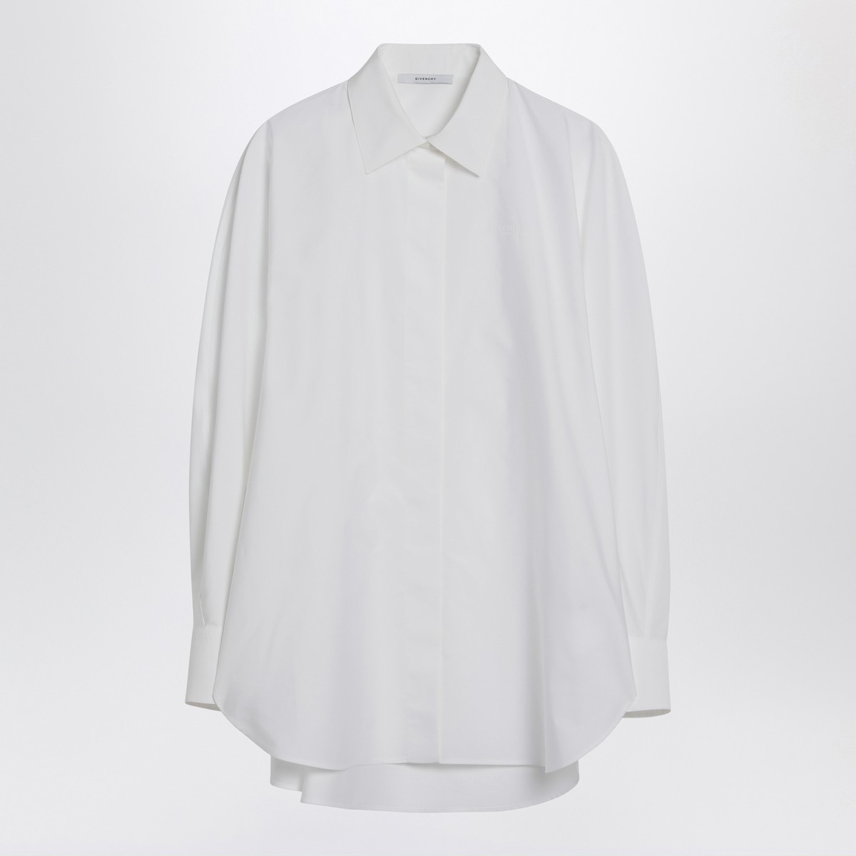 Wide Givenchy white cotton shirt, characterized by hidden front buttoning, long sleeves with buttoned cuffs, and a curved hem that is longer at the back.