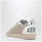 Sneakers by Golden Goose Deluxe Brand in white and green leather and textile with a vintage effect, featuring lace-up closure, side star patch, round toe, silver metallic heel, tongue with logo patch and contrasting rear logo lettering.