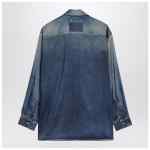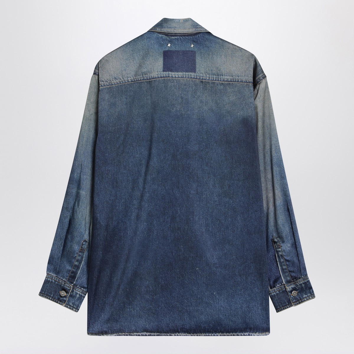 Golden Goose Deluxe Brand oversized shirt in blue fabric with worn denim print, featuring classic collar, front button closure, chest flap pockets with buttons, long sleeves, buttoned cuffs and double star on the back.