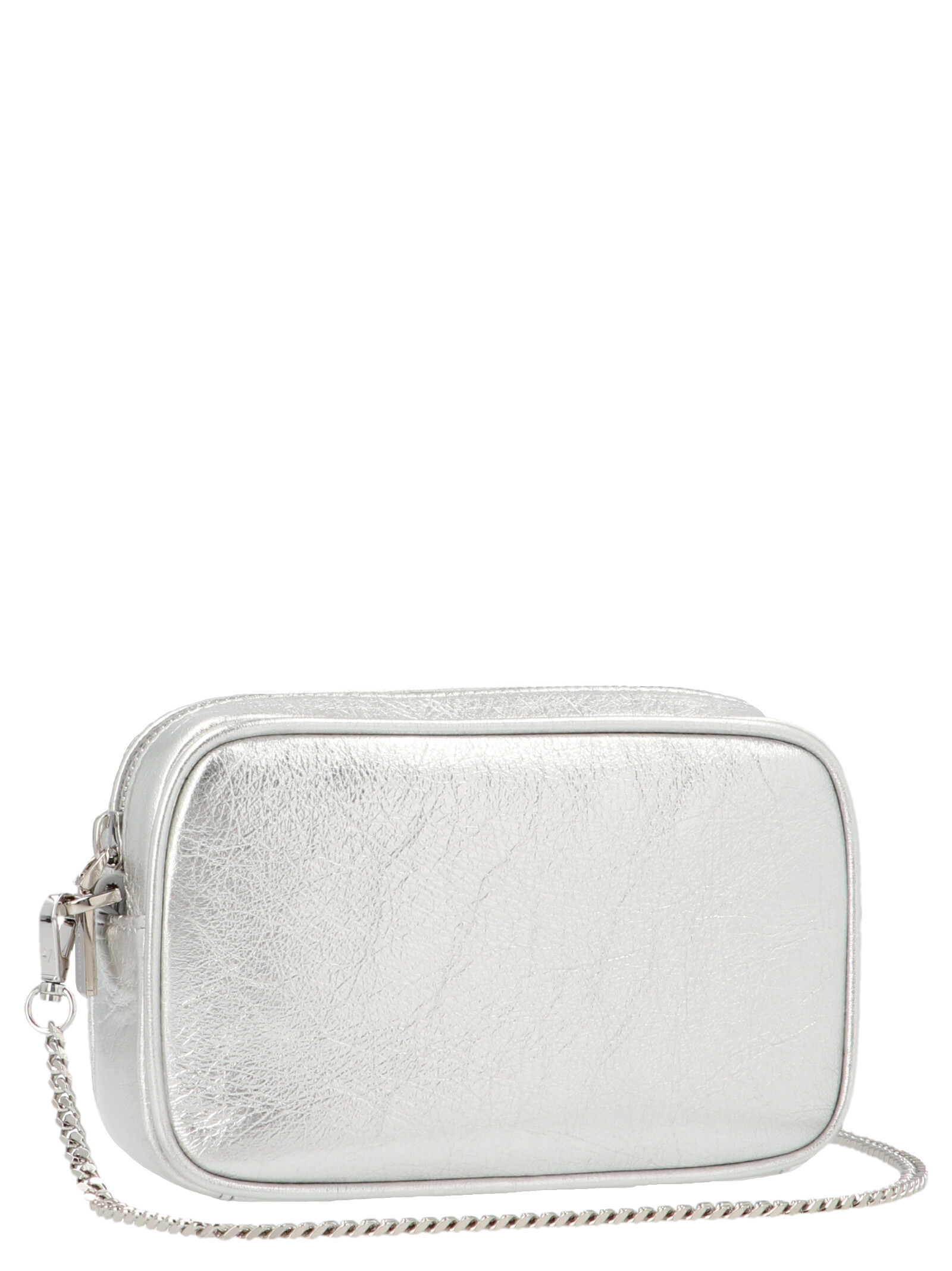 ‘Mini star’ wrinkled-effect patent leather crossbody bag with tone-on-tone logo patch, adjustable and removable shoulder strap and zip closure.