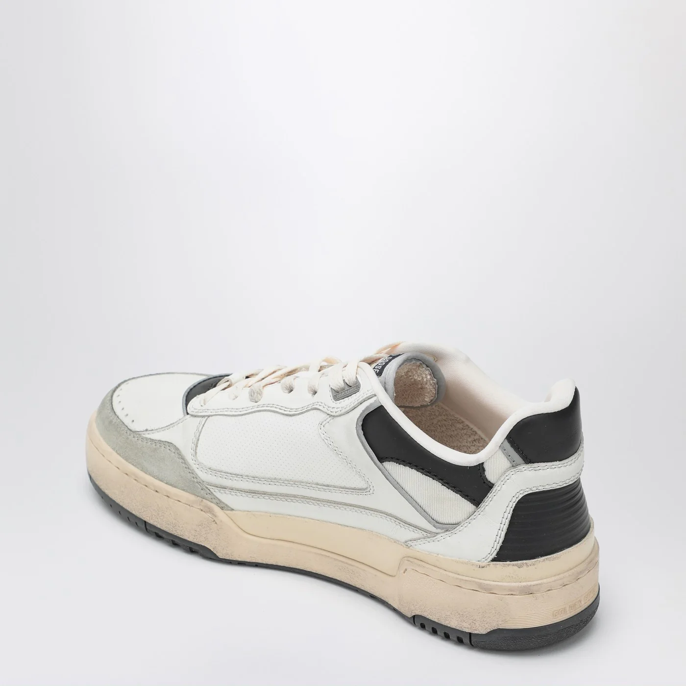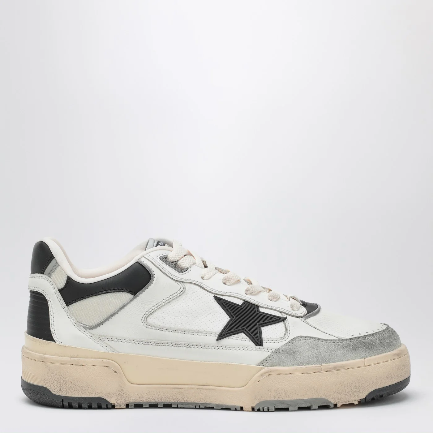 White leather sneakers by Golden Goose Deluxe Brand featuring lace-up closure rounded toe tongue with logo patch black side star rubber sole and suede details with vintage effect.