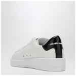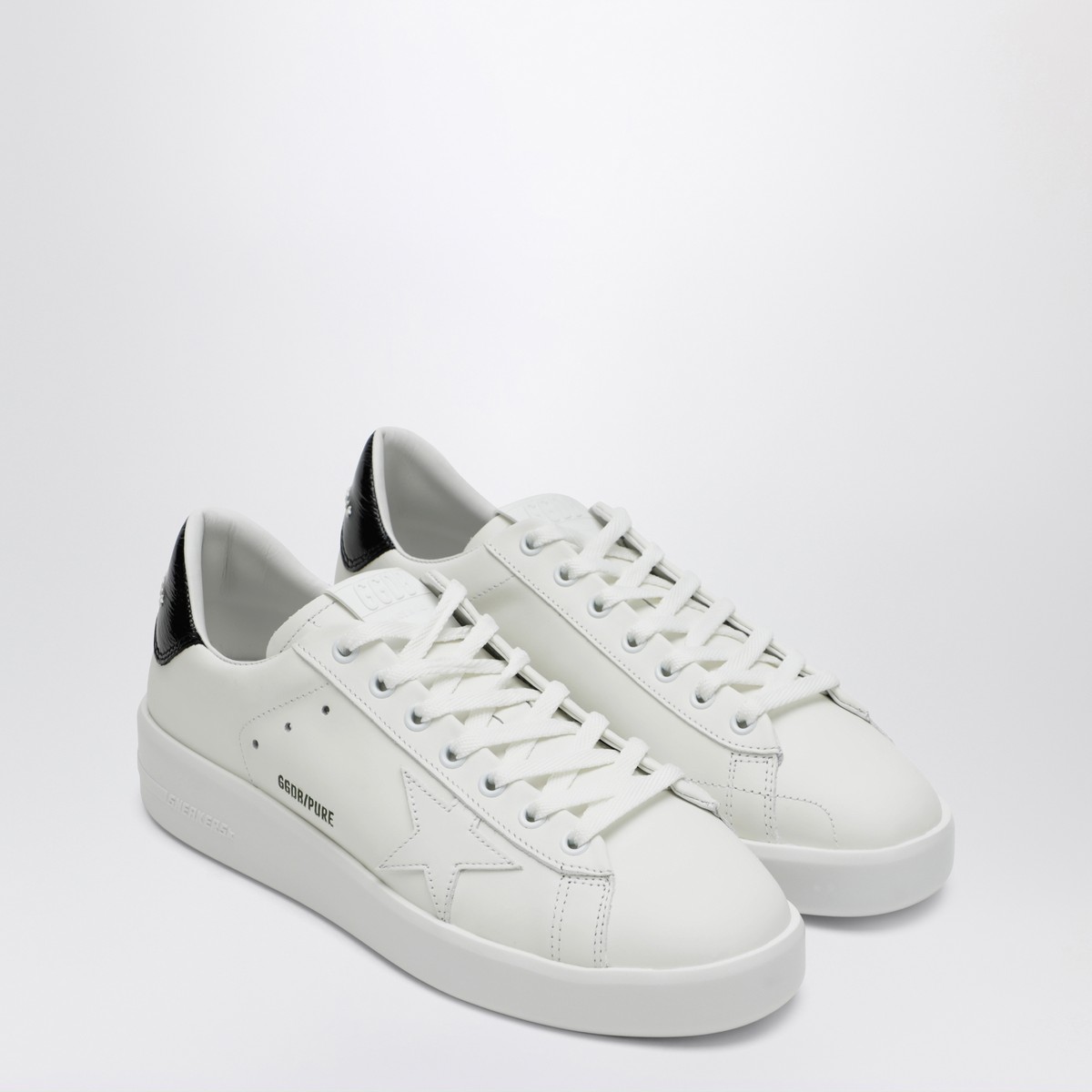 White leather sneakers by Golden Goose Deluxe Brand, featuring lace-up closure, tone-on-tone star patch on the side, side logo writing, round toe, black leather heel with logo print detail, and rubber sole.