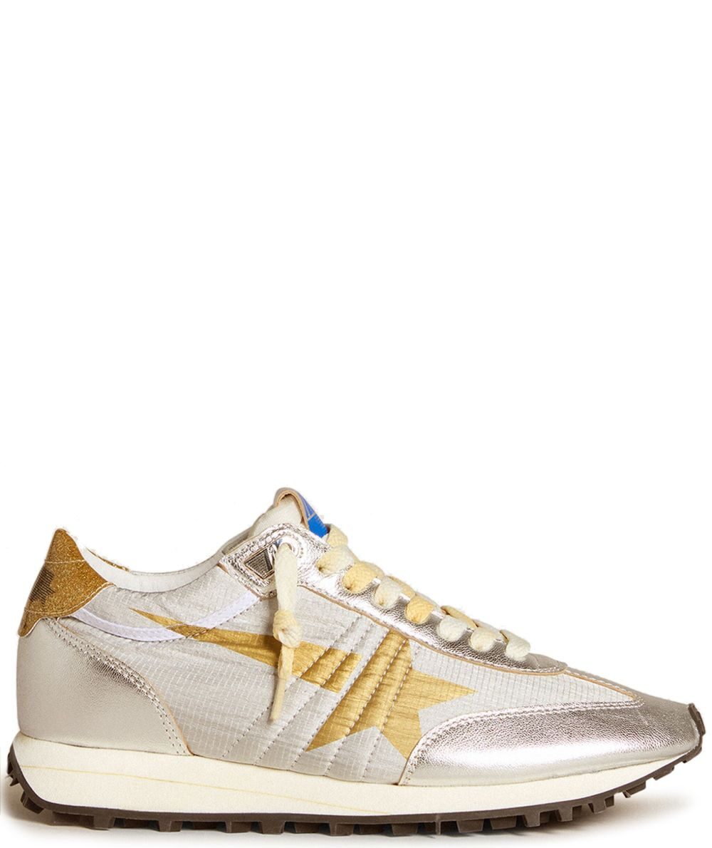 silver-tone sheepskin and ripstop nylon upper rubber gold star laminated finish rubber sole glitter heel tab jacquard laces This piece is handmade, meaning your purchase is unique and may vary slightly from the item pictured. Marathon sneakers
