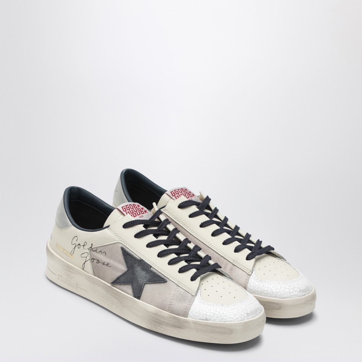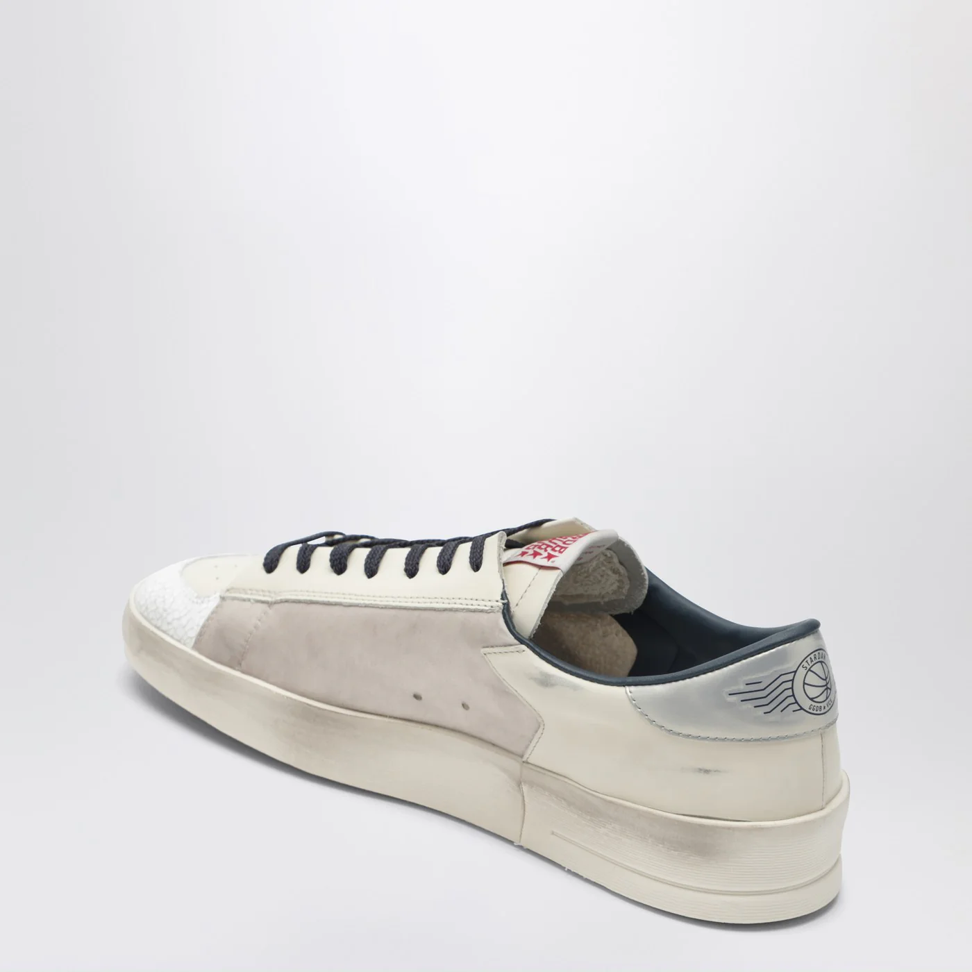Golden Goose Deluxe Brand sneaker in cream and blue leather, featuring lace-up closure, lateral star patch, lateral logo lettering, vintage-effect finish, round toe, leather heel with logo print detail and rubber sole.