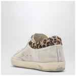 Golden Goose Deluxe Brand sneakers in light beige suede leather with vintage finish, featuring round toe, lace-up closure, brown leather lateral star patch, pony hair heel tab, logo label on the tongue, and lateral logo print.