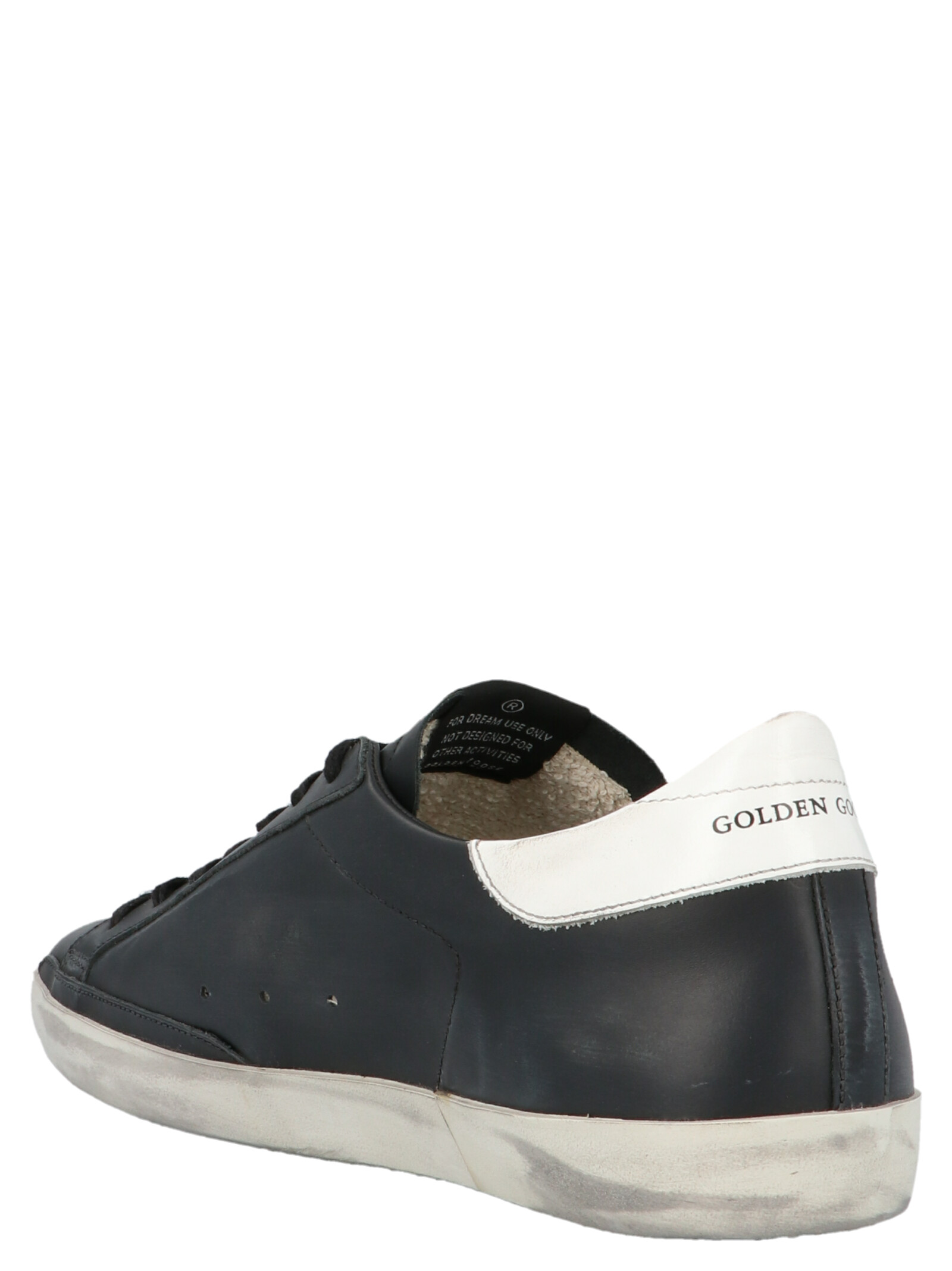 ‘superstar’ sneakers in black leather with a star, And a contrasting white vintage effect heel tab. Size and Fit – EU MEN