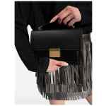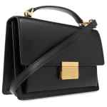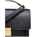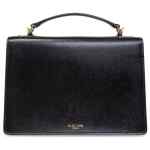 Black, calfskin, square body, single flat top handle, adjustable and detachable shoulder strap, main compartment, front snap closure. Venezia leather handbag
