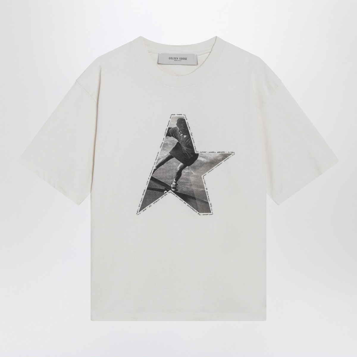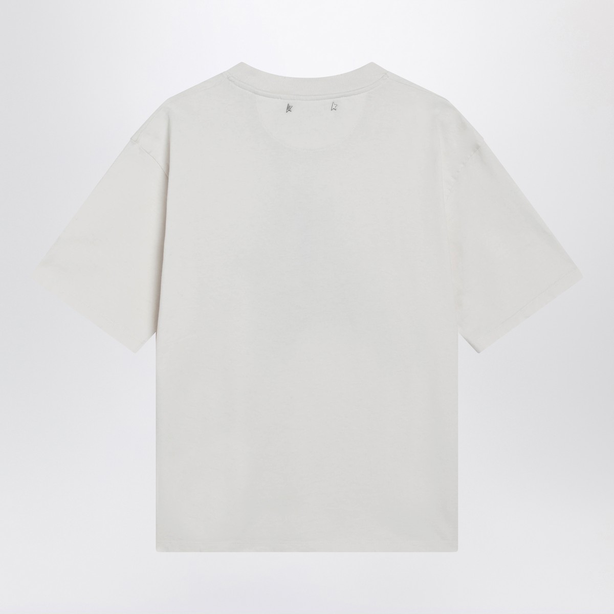 Golden Goose Deluxe Brand white cotton T-shirt, featuring a ribbed crew neck, front logo print, distressed details, short sleeves with dropped shoulders, and double star logo on the back.