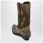 Golden Goose Deluxe Brand boots in khaki leather and suede, featuring a pointed design, embroidery, a cowboy heel, and a leather sole.