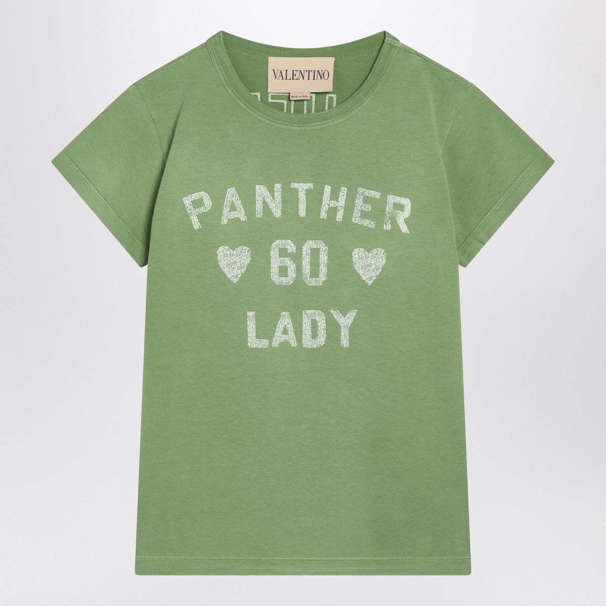 Valentino green cotton vintage effect T-shirt, featuring short sleeves, ribbed crew neck, front print, and contrasting Chez Valentino embroidery on the back.