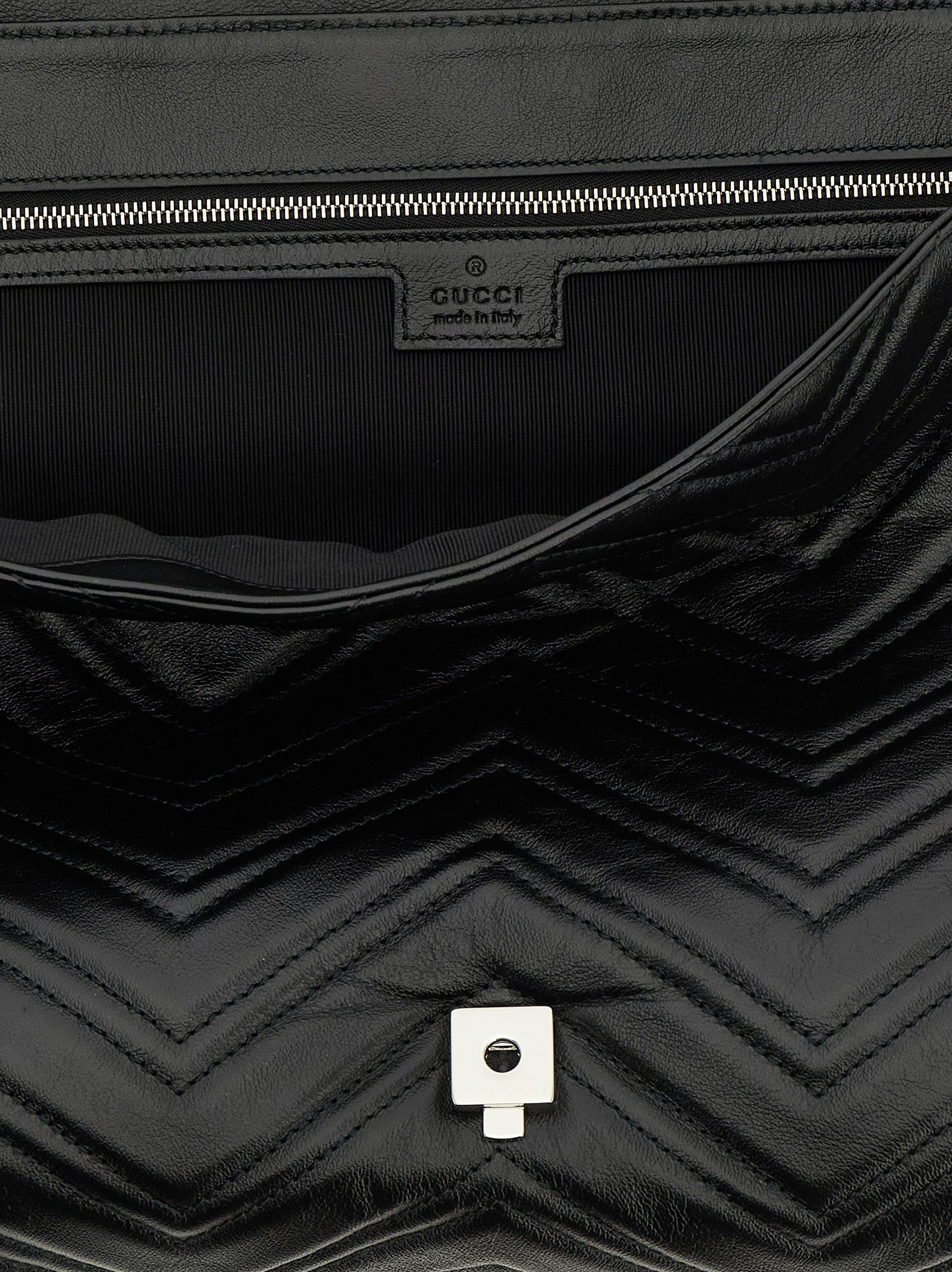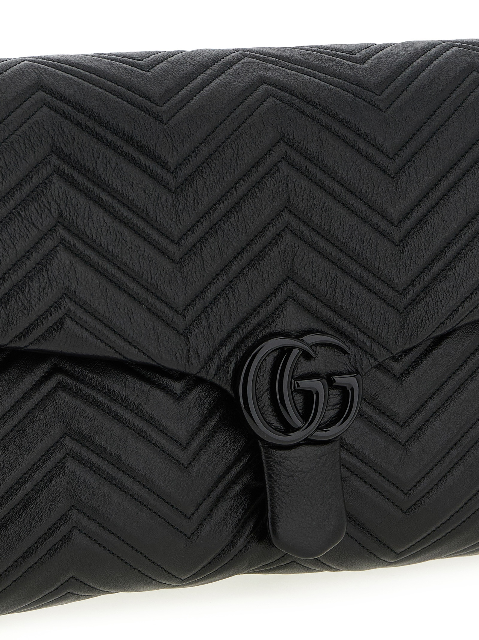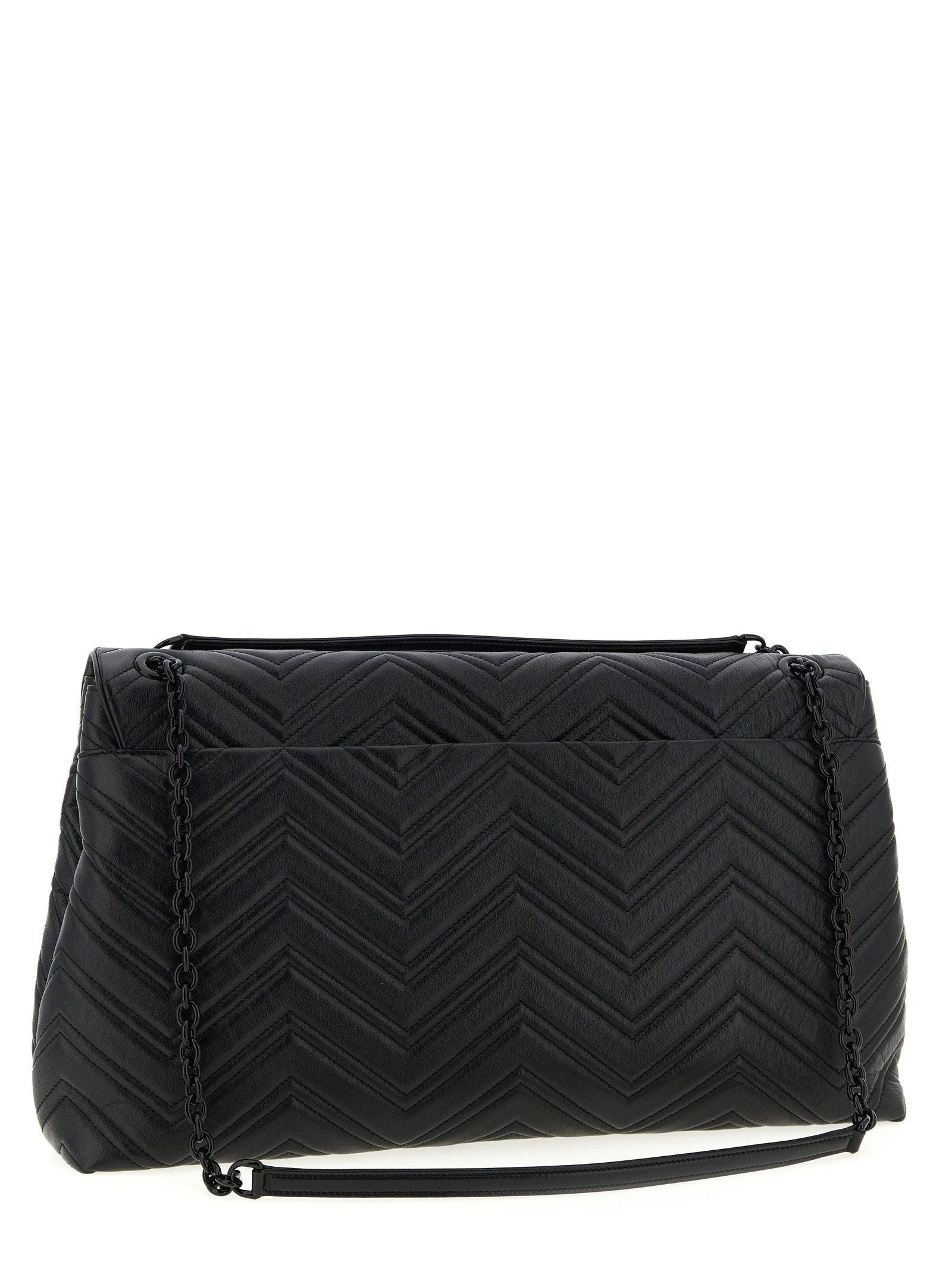 ‘gg marmont’ maxi shoulder bag in chevron-patterned matelassé leather, Magnetic flap closure with tone-on-tone metallic ‘double g’ detail on the front, Back pocket, Tone-on-tone faceted chain shoulder strap with leather protection. Size and Fit – W 47 x H 25 x D 9 cm