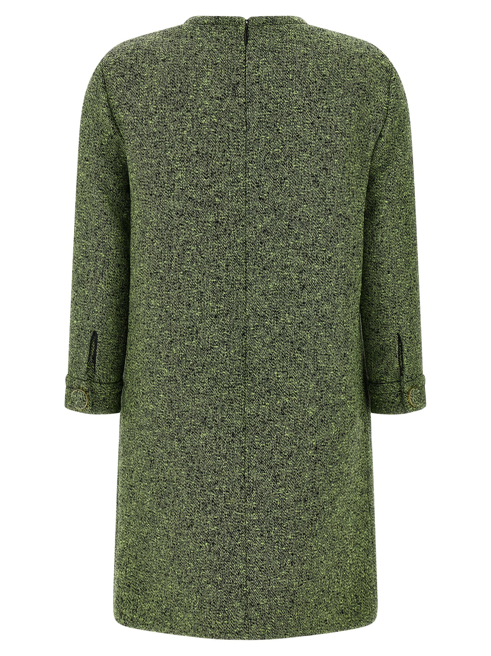 ‘mouliné’ wool and cotton blend mini dress, Crew neck, Unlined, Front patch pockets, Back closure with hidden zip, Slightly padded seams, Long sleeves. Size and Fit – True to size fit
