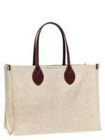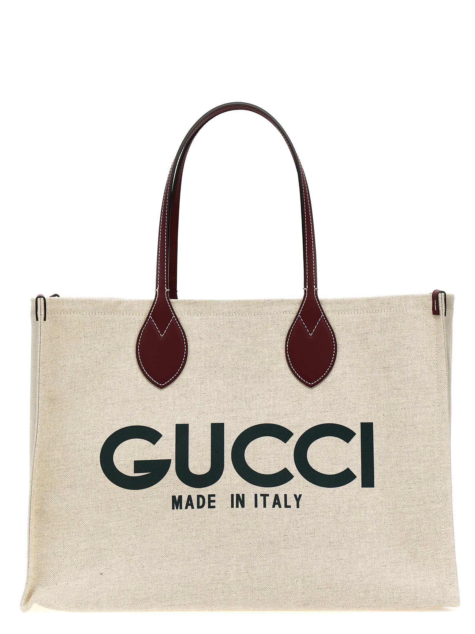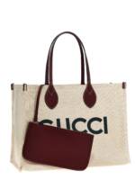 ‘gucci’ canvas shopping bag with front logo print, Leather details, Double handle, Internal clutch. Size and Fit – W 45.5 x h 32 x d 20 cm