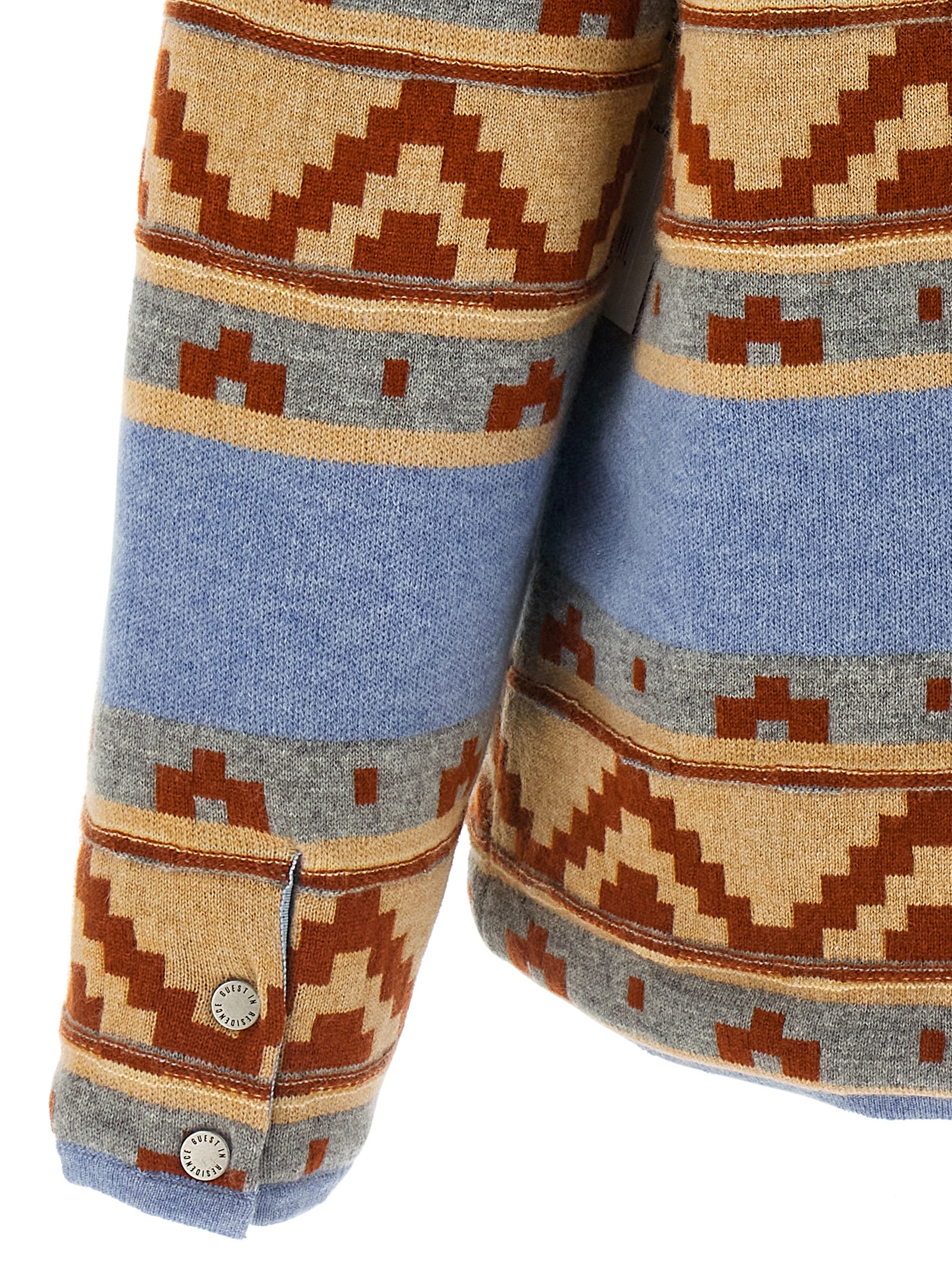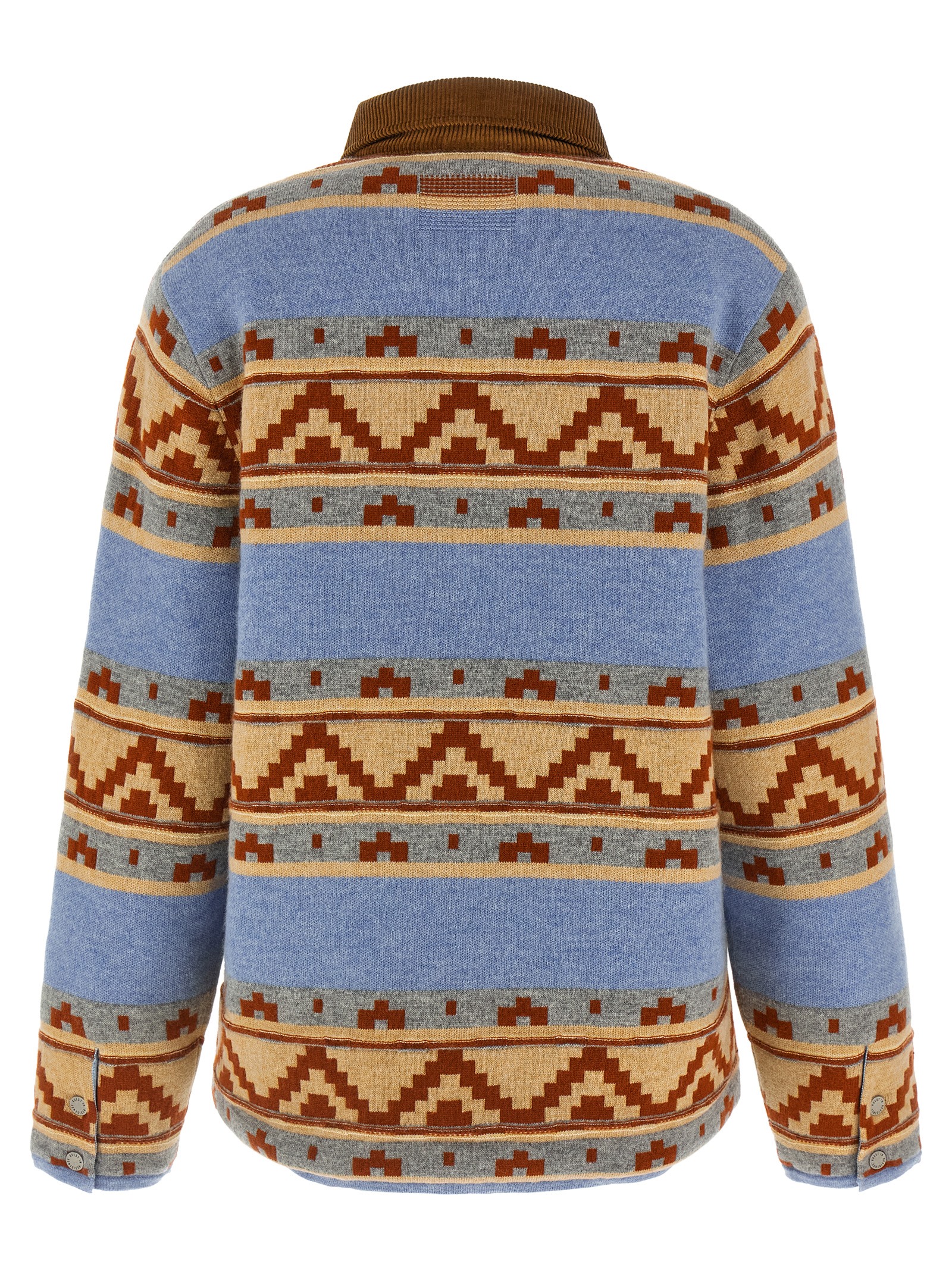 ‘western industry’ mercerized wool and medium-weight cashmere jacket with jacquard pattern, Slightly padded quilted nylon lining, Corduroy collar and flap, Front snap button closure, Pockets, Long cuffed sleeves. Size and Fit – Relaxed fit