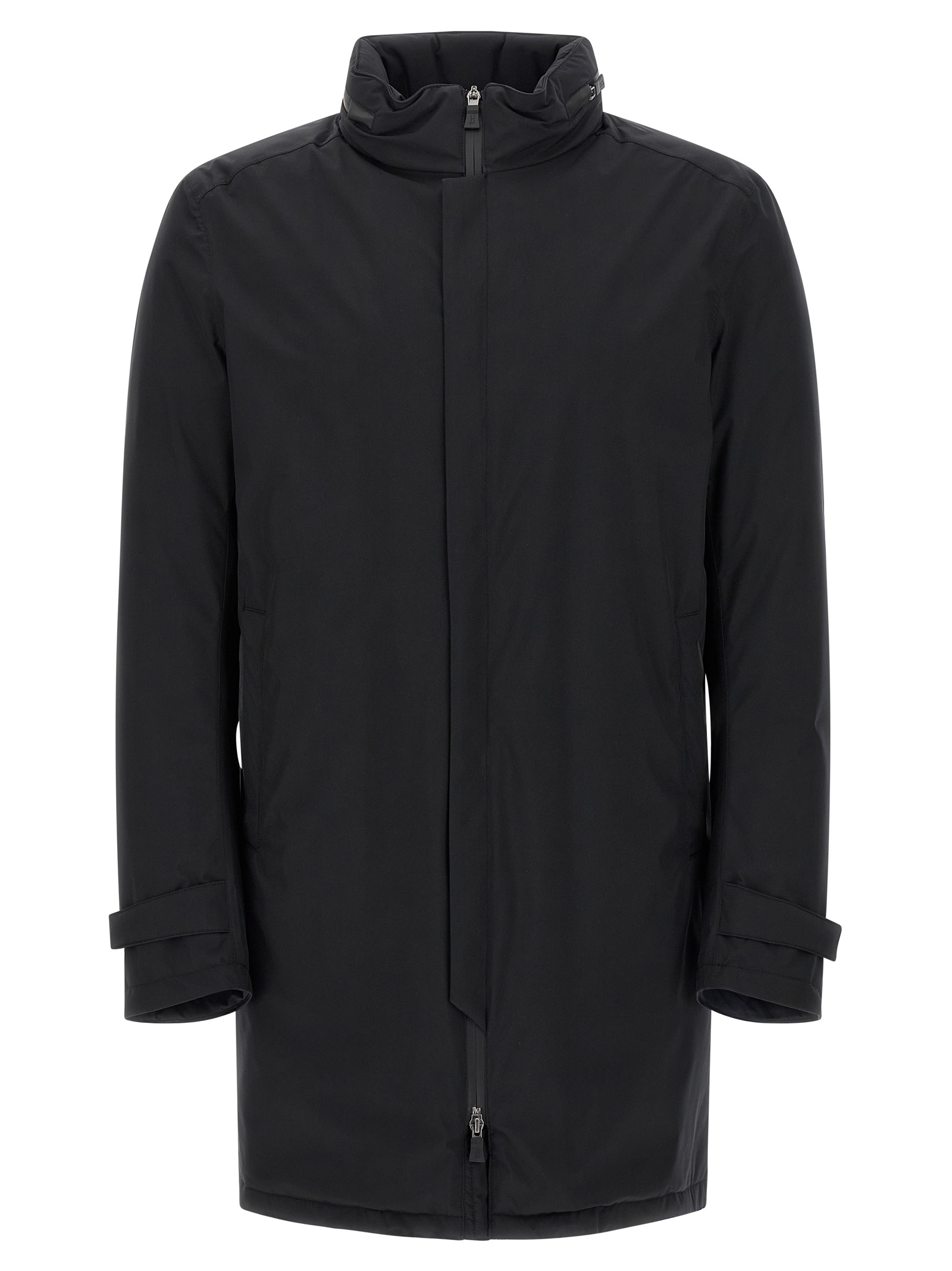 ‘Pro-Meteo’ parka in water-repellent technical fabric, quilted lining slightly padded with goose down, front zip closure, high neck with removable hood, pockets, long sleeves with cuffs and windproof gaiter.