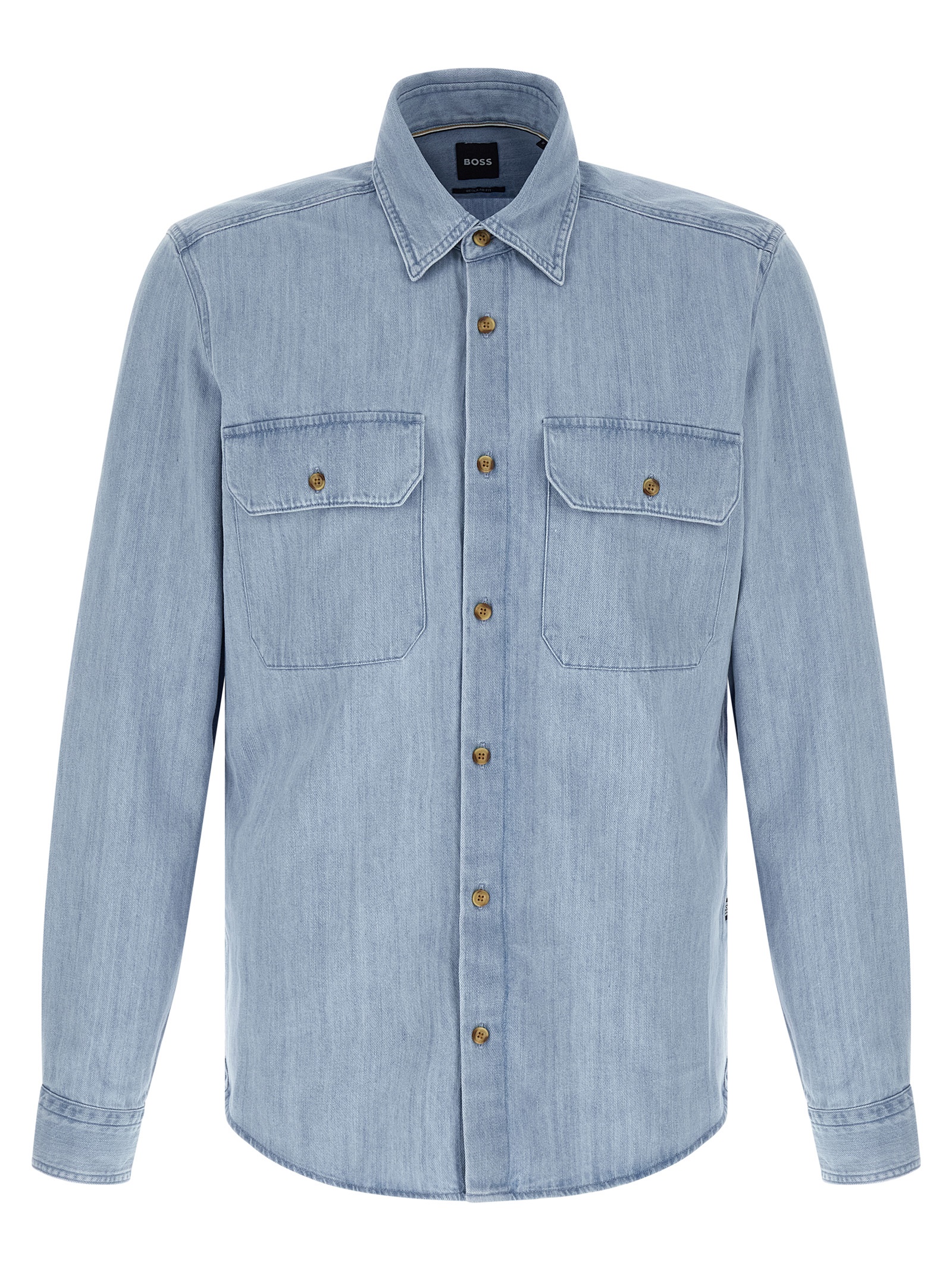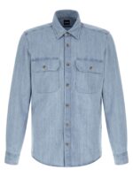 ‘h-liam’ cotton denim shirt with front button closure, Pockets, Long cuffed sleeves. Size and Fit – true to size fit