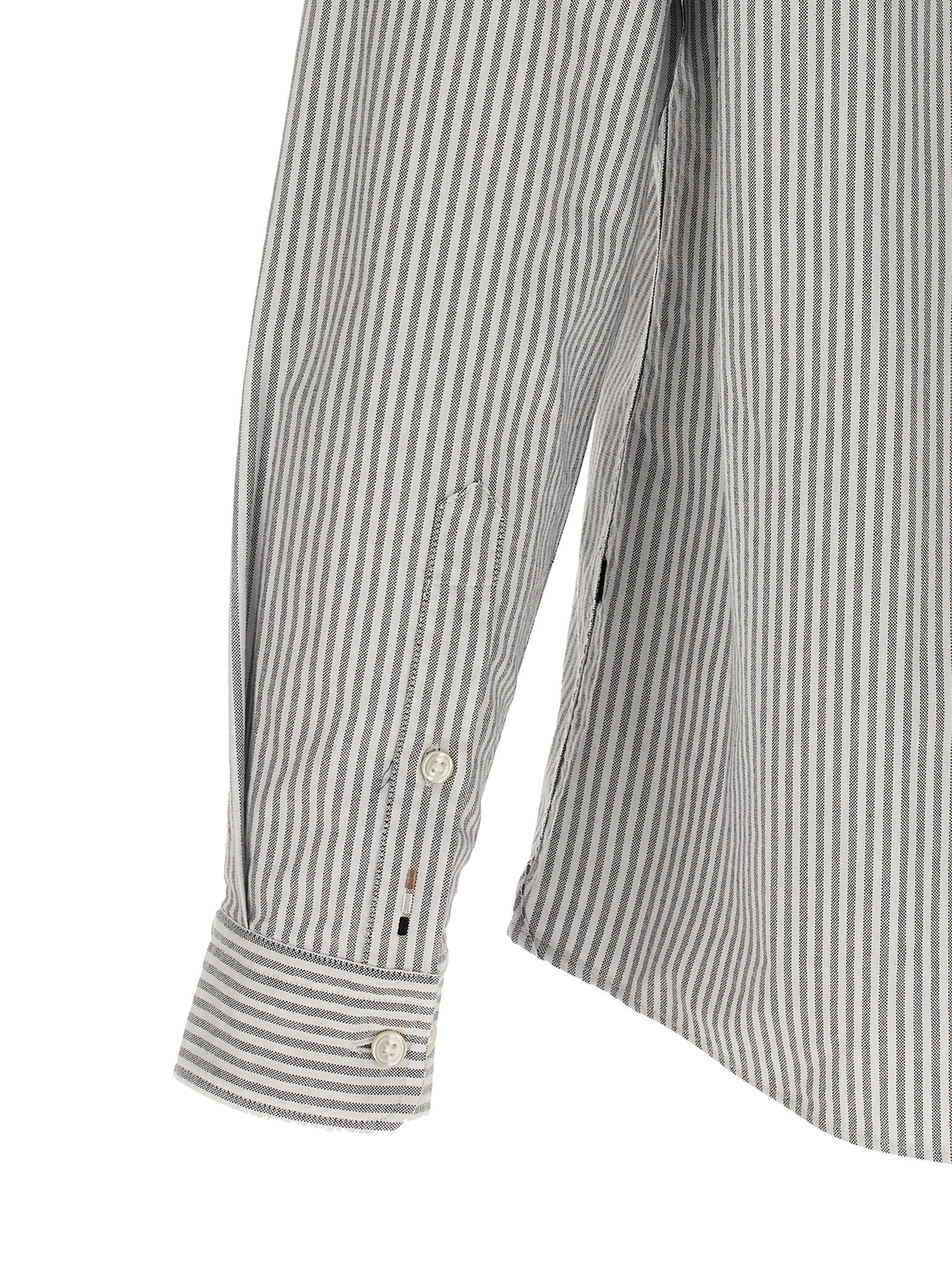 ‘ronan’ striped oxford cotton shirt with button-down style, Logo embroidery and front button closure, Long cuffed sleeves and rounded hem. Size and Fit – Slim fit