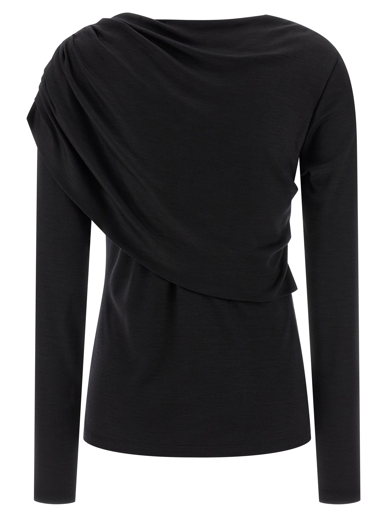 ‘asna’ draped wool jersey top with round neckline, Curled insert on the shoulder, Long sleeves.